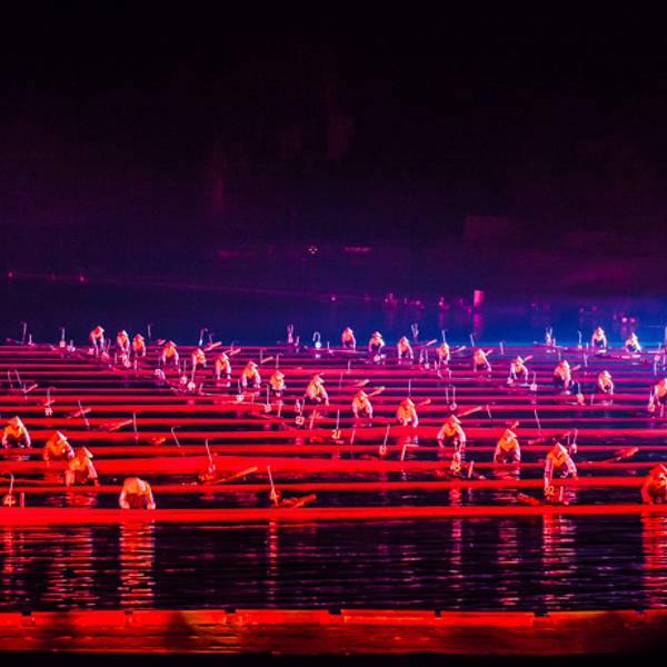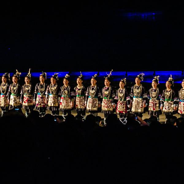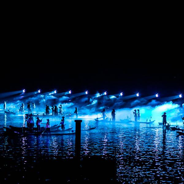 一、《印象·刘三姐》《印象·刘三姐》大型山水实景演出由著名导演张艺谋、王潮歌、樊跃任总导演,国家编剧梅帅元为总策划,集漓江山水、广西少数民族文化及中国精英艺术家创作之大成,是全国第 一部全新概念的“山水实景演出”,开创了中国大型实景演出的先河,成为国内文化产业成功运作的典范。《印象·刘三姐》由张艺谋、王潮歌、樊跃导演,梅帅元总策划,四名主创合作完成;传承自广西歌仙刘三姐的传说,但不局限于其一人的故事,而是运用中国国画的构图与手法融入真山真水,结合少数民族歌曲的独特节奏与韵调,将漓江沿岸的自然风景、渔民村民的生活劳作、少数民族的民俗风情等,通过视觉效果和艺术编排进行融合与呈现。演出整体没有连续的故事脉络、没有准确的歌词翻译,而是以刘三姐为引,通过写意的画面与耳熟能详的山歌,代表性地展示出广西壮、瑶、苗、侗等少数民族的风俗风情以及漓江周边的百家万象。《印象·刘三姐》从2004年3月公演以来,已累计演出超8000场,是中国实景演出的标杆。二、《印象·刘三姐》演出章节介绍序:山水传说演出的缘起篇。经典场景:山水舞台点亮,刘三姐乘竹筏而来。“唱山歌嘞,这边唱来那边唱……”山歌缘水而起,纵穿峦峰,夜空谱写着传说的梦境。歌仙刘三姐,乘船而来,放声歌唱,自山水间诞生。章节一:红色印象/山歌演出的风情篇。经典场景:对歌、红绸。少数民族男女挥舞火把,隔岸对唱山歌,抒发着对山川和江流的敬意,也表达了年轻人之间的绵绵情谊,代表着当地少数民族对歌的传统文化。渔民们穿着蓑衣和斗笠,挥舞着竹竿在漓江上畅游。舞动的红绸象征繁密而沉重的渔网,结合竹筏多样的阵列变化,将漓江渔民们每日的辛苦劳作尽情展现,传递出当地人文生活与自然山水和谐共存的印象。章节二:绿色印象/家园演出的生活篇。经典场景:侗族大歌(侗族少女原声献唱)。落霞伴着炊烟,牧童蹦跳着引领牛群,鱼鹰乖巧地坐在竹筏上和渔民一同捕捞,河边洗衣的村妇、村口嬉笑玩耍的少年…勾画出漓江人民的日常生活景象。一幕幕乡村图景影射出刘三姐的生活情境,感悟着山歌故乡的美丽与悠然。章节三:金色印象/渔火演出的夜幕篇。经典场景:漓江渔火。渔民们竹筏上长明的油灯,好似天上闪耀的星光,被称为漓江渔火。夜幕伴随暖光,纪录着渔民们辛勤的汗水与丰收,呈现着古朴劳作方式的自然传承。章节四: 蓝色印象/情歌演出的爱情篇。经典场景:月牙精灵舞蹈、沐浴、嫁娶。守护山水的精灵在月牙上舞蹈,照亮了夜幕中的漓江,温柔地庇佑着万家灯火。少女们在江水旁沐浴更衣,迎送着待嫁的姐妹,为她缓缓穿戴嫁衣、依依惜别;新娘穿戴整齐,挥别家人,登上新郎的小船,三鞠躬致山水敬亲人,深情挥别。章节五:银色印象/盛典演出的华彩篇。经典场景:银珞。黑暗中,少数民族姑娘穿着特制的银灯服饰(苗族盛装),手拉着手,缓缓步入漓江之上。她们周身闪耀着节日的华彩,或整体、或交替、或三两一群、或独自一人,通过队形变化与灯光的明暗组合,与山水成画,同天地舞蹈,抽象地展示出本地文化风俗的绮丽华影与节庆气氛。尾声:天地颂唱演出的谢幕篇。经典场景:全体演员谢幕(渔民演员来自猫仔村、兴坪村、田家河村、木山村、木山榨村等周边五个自然村)。渔火渐远,灯光熄灭,刘三姐的山歌仍在天地间唱颂,《印象·刘三姐》感恩山水,感恩四方宾客!三、《印象·刘三姐》亮点(一)独 一性自然地理风貌《印象.刘三姐》之所以震撼人心,正是因为桂林阳朔这 一片山水的支撑和浸润:方圆两公里的漓江水域,书童山为首的十二座背景山峰,远远区别于传统搭建,是闻名内外的山水实景剧场。(二)代表性特色民族主题《印象·刘三姐》代表性地展示了壮族、瑶族、苗族、侗族等少数民族的风俗风情以及百家万象;演出中会出现广西少数民族传统的现场对歌、极 具本地特色的打渔与耕作、嫁娶、节日盛典、以及原生态的日常生活细节。(三)传播性广为人传的刘三姐文化1961年电影《刘三姐》将歌仙刘三姐的故事形象化、戏剧化,成为了人们心中的经典标识与岁月记忆。《印象•刘三姐》参考并梳理了各类素材,竭力做到广取博收,将刘三姐所代表的文化精髓通过艺术化的手法和诗意化的编排进行融合和呈现,打磨刘三姐成为广西的文化名片。(四)高端性明星艺术创作团队《印象·刘三姐》是全球第 一部全新概念的山水实景演出,由著名导演张艺谋、王潮歌、樊跃任总导演,国家 一 级编剧梅帅元任总策划,演出方案历经5年零5个月前后109次修改,67位中外著名艺术家参与创作,演出时长70分钟,演出人员600多人。
