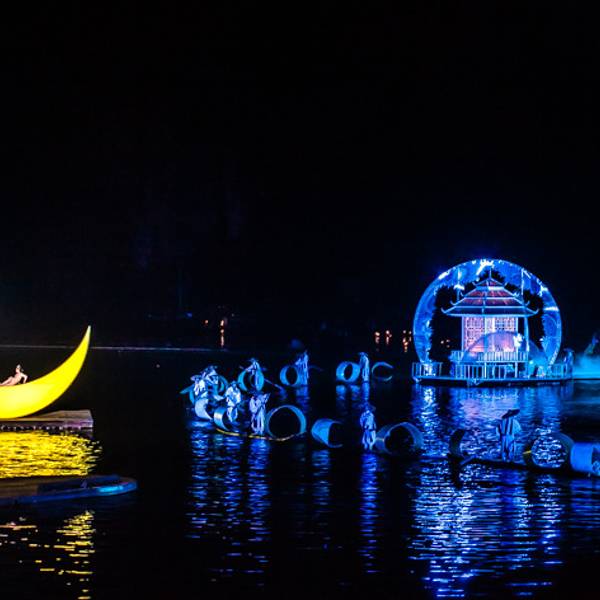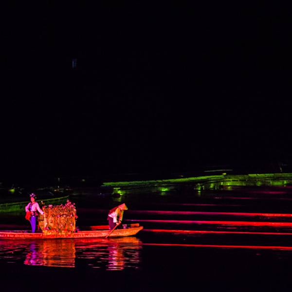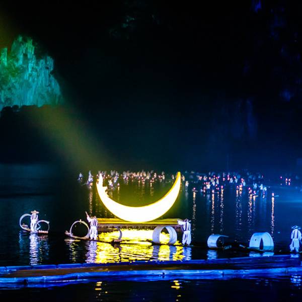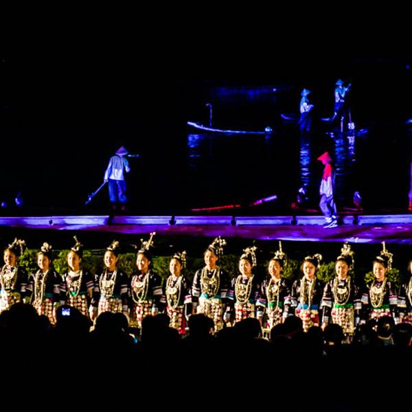 1迷人的灯光,与自然山水的完美结合,造就了《印象刘三姐》的梦幻场景。 走进山水自然搭建的剧场,跟着变幻莫测的灯光,仿佛穿越时空隧道,回到历史的舞台,身临其境地与那梦中的场景,完成了一次神奇的对话。