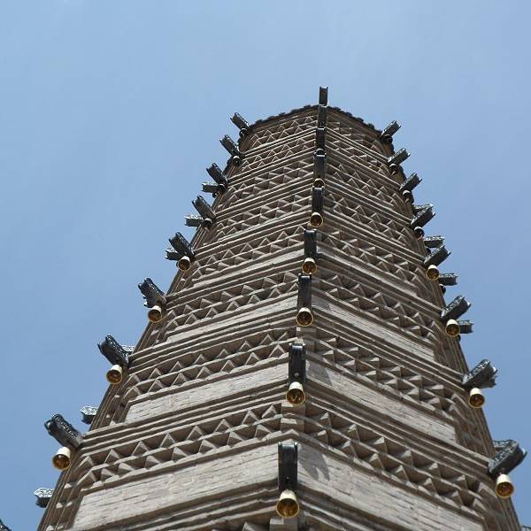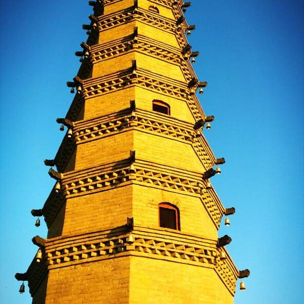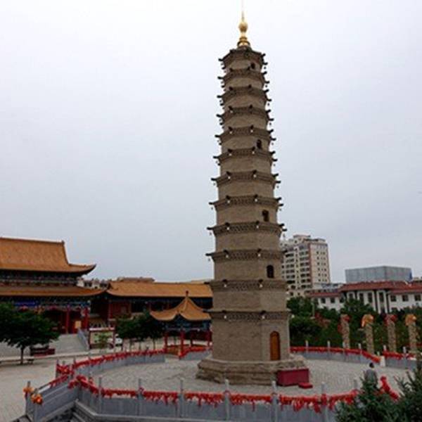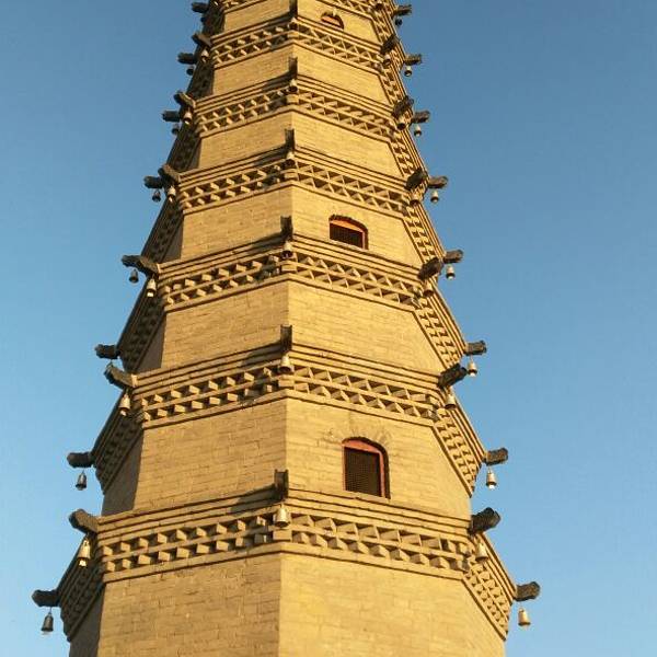 现存罗什寺塔八角十二层,高32米,全以条形方砖砌成。从下起第三、五、八层均没门,顶部是葫芦形的铜质宝瓶,最上层东西各有小佛龛,龛内有佛像,据说是真金的。