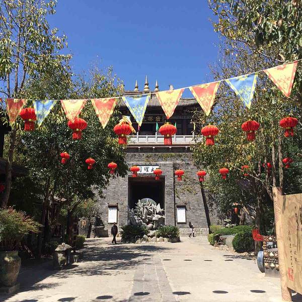我们跟着迎亲队伍一起进了门。这是一进门的神话武打人物雕塑一进门左侧可以上城楼城楼上可以看到大理全景,很漂亮的也可以俯瞰影视城的街道。城楼还有一个密室逃脱的游戏,收费10元/人。走上了影视城的主街道