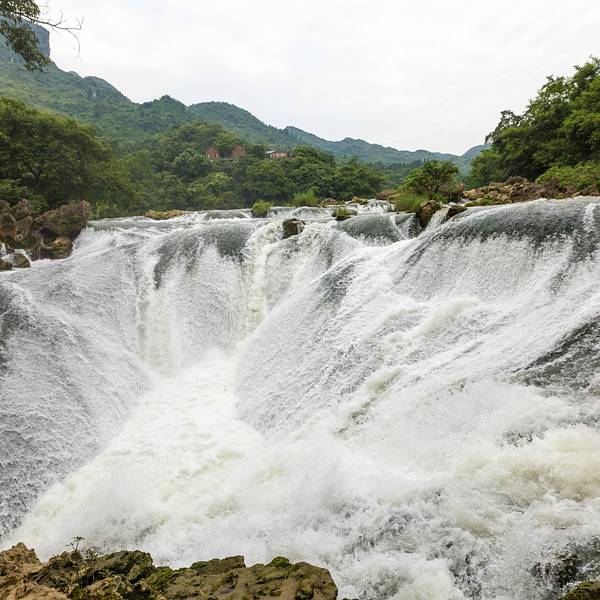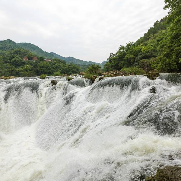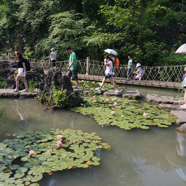 入目的同样是荷塘,不过周围有了完整建筑物的样子,横亘在荷塘之上的也是修建的比较精美的木梯道路。这里是天星桥景区重要的景点之一的“高老庄”,同样也是经典国剧《西游记》中的取景地。天星桥景区的所有转折也从此拉来了帷幕,黄果树瀑布的联票是可以两天参观的,所以在人多之时只有安排两天才能很葱郁的游览三个景区。旅行社带团游玩黄果树瀑布,几乎都是三个景区在一天之内游玩。