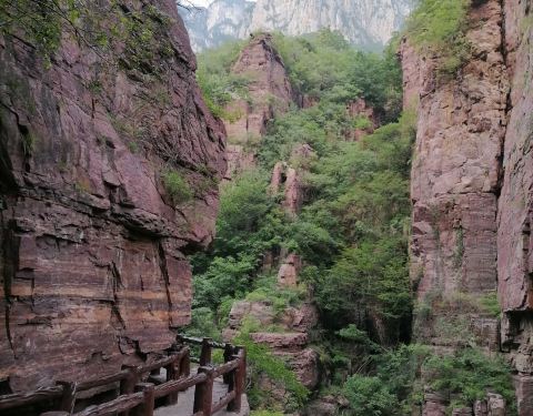 红石峡是云台山风景名胜区的标志性区域,也是风景区内精华的区域,大多数游客在游览云台山风景名胜区时,会把红石峡作为一个游览的区域。游客在进入云台山风景名胜区大门后,可以乘坐景区内的观光车(费用包含在门票内)到达峡谷入口,然后顺着峡谷内的栈道,步行游览整个峡谷。峡谷是单行通过,峡谷的出口靠近云台山的小寨沟景区(包含泉瀑峡、小寨沟景区、猕猴谷)。红石峡,有“盆景峡谷”之称,当你步入谷中的栈道,红色的山石扑面而来,这里属于丹霞地貌,岩石都是红色的,“红石峡”因此得名。这里既有北方山川的雄浑,又有江南水乡的秀丽,在谷中的栈道中漫步时,抬头仰望,可以看到两边峭壁林立,犬牙交错。谷内树木郁郁葱葱,还能看到众多的飞瀑溪水,耳边可以听到涛涛水声,宛如是江南的秀水青山。整个峡谷还是一个地质博物馆,峡谷内分布着各个地质年代的岩石。如果你是个地质迷,那你能够在这里看到4亿年前奥陶系石灰岩, 5亿年前寒武系的石灰岩,10亿年前中元古代紫红色石英砂岩。在红石峡的白龙潭,地质专家还发现了34亿年前的锆石,据说是目前地球上发现的较古老的岩石。