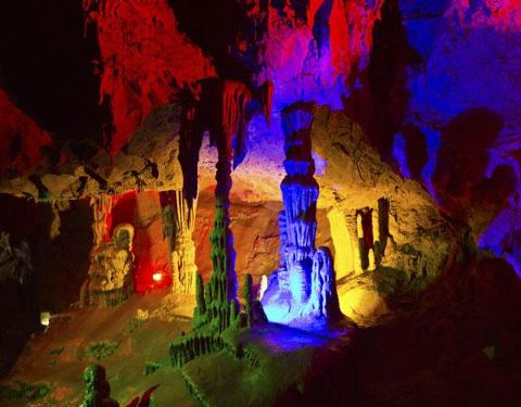 洞中布置的彩灯非常的漂亮,要跟着解说员前进,不然会错过很多的景点。站在鱼谷洞出口看山下美景
