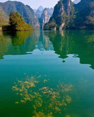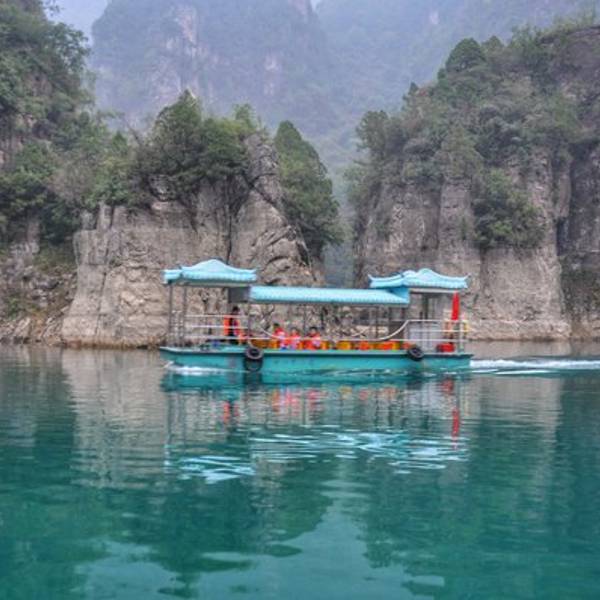 走过1700多个台阶至天王峰码头船游峡谷。峰林峡谷底一泓湖水,清洌洌让人醉心