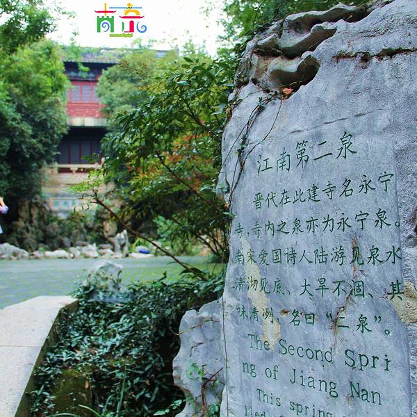 雨花台风景区的著名景点"江南第二泉",她原名雨花泉,泉有二孔,水出地面1米,纤湮缕浸,清洌甘美,色味俱绝,南宋著名爱国主义诗人陆游到四川任职时途经建康,登雨花台游览,用泉水沏茶,备加赞赏,品为二泉,位列金陵名泉之首。明代赵谦为二泉题匾,"江南"二字为后人所加,现在镌刻在大理石上的"江南第二泉"是当代著名书法家萧娴题写。
