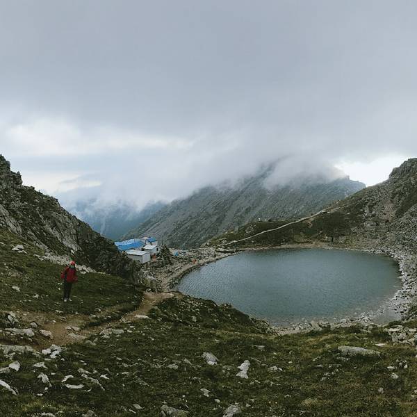 同样是冰川圣湖,却更加远离人间的侵扰,身处山坳之间的二爷海更加纯美而安静。回头看看来时的路,还有人在山间乱石中继续登顶。