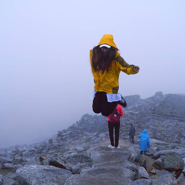 不过很快的,那些捣乱的灰色云彩不知从哪里飘来,慢慢吞噬了日出的彩云。拔仙台也慢慢淹没在云海中,这时候突然意识到风那么的冷,连着带着两个帽子都被风吹翻。幸好机智如我,提前用小发卡別住头发和帽子,在他起飞的那一刻,我也眼疾手快的抓住了,避免帽子葬身在拔仙台。“姑娘冷不冷”~~冷!因为大风太嚣张,人能被吹美(gua)