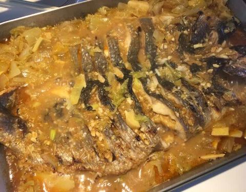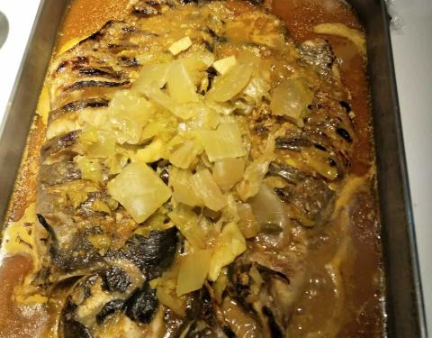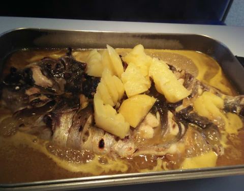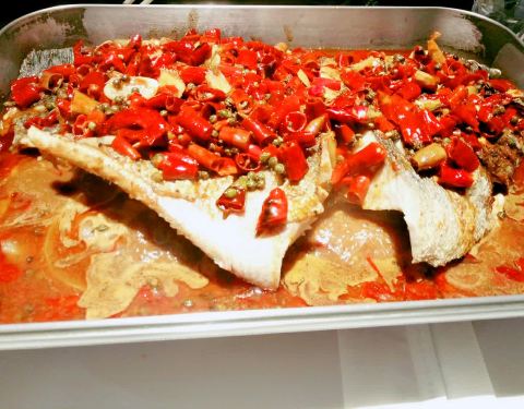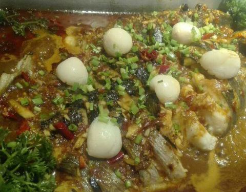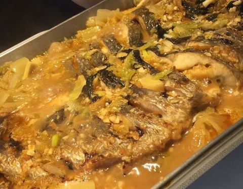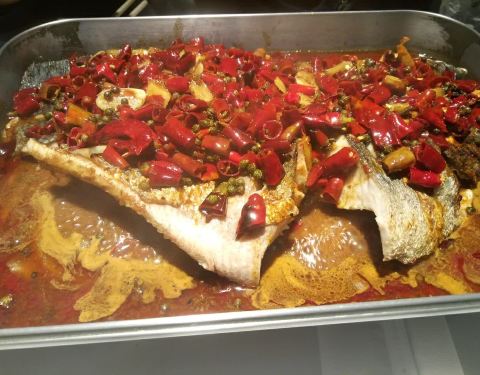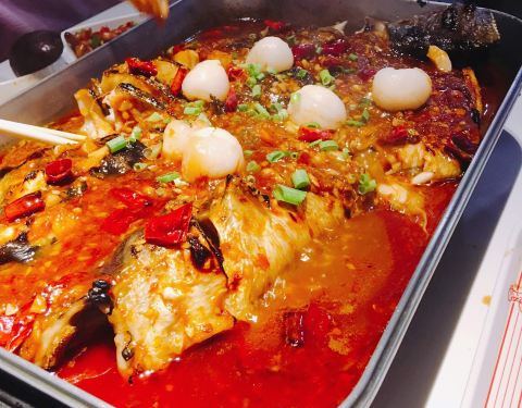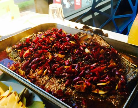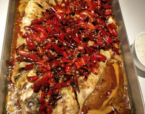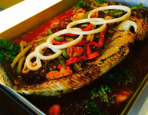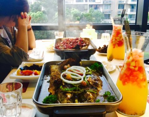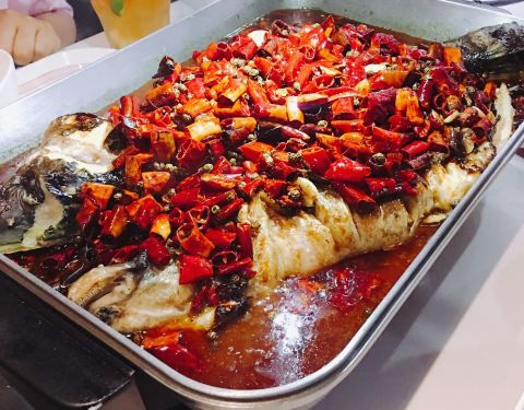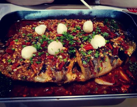 最卖人气的属荔枝香辣汁的清江鱼,63块钱一斤,一盘子2斤6量左右配料有五颗去核的嫩荔枝肉拌上绿葱花很有特色,三个人也恰好吃的完,。鱼的确是现杀现烤的味道很鲜,另外黄金酸辣味的烤鱼吃上去还是挺辣的。