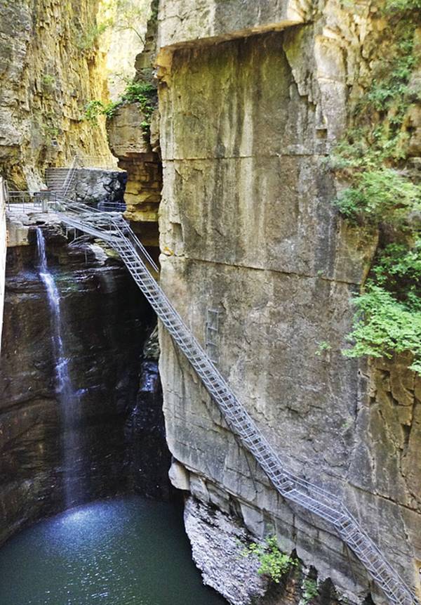 红豆峡山西壶关太行大峡谷的一个支脉峡谷。景区可分为两部分,左侧的三叠潭景区和右侧的七仙峪景区。七仙峪是红豆峡沿西北向延伸的一条支峡,是商周白陉咽喉要冲,通峡迂回,壁高隐谷。许多远古系岩层裸露,化石罗列,古沾水直灌其谷,飞瀑雕岩,形成了七瀑七潭的胜景。相传七仙女曾在此沐浴。大多数游客都比较茫目地先到七仙浴景区,我们也过去走了一段,很快发现该上山了,而且太早峡谷里面没有阳光。突然反映过来,应该先乘电瓶车上山到红线洞,穿洞过来向下游览七仙峪景区,一是省力,上山用车,下山再用脚;二是那时也许峡谷中会有些阳光了。毫不犹豫地调头回到入口处乘电瓶车,穿红线洞,开始下山。不下不知道,一下吓一跳,好陡好高的铁台阶,若是向上爬,打死也是上不来的,只能到底下再原路返回,那时心中还不定怎么后悔呢,庆幸自己快速反映过来了,下山时见到那些向上爬的游客不时地问我还有多高时,心中别提多自豪了,旅游达人就是聪明啊!其实七仙峪这边的峡谷也没多长,下来没走多远就到了刚才调头地方了。这个峡谷可比八泉峡的景色差远了。