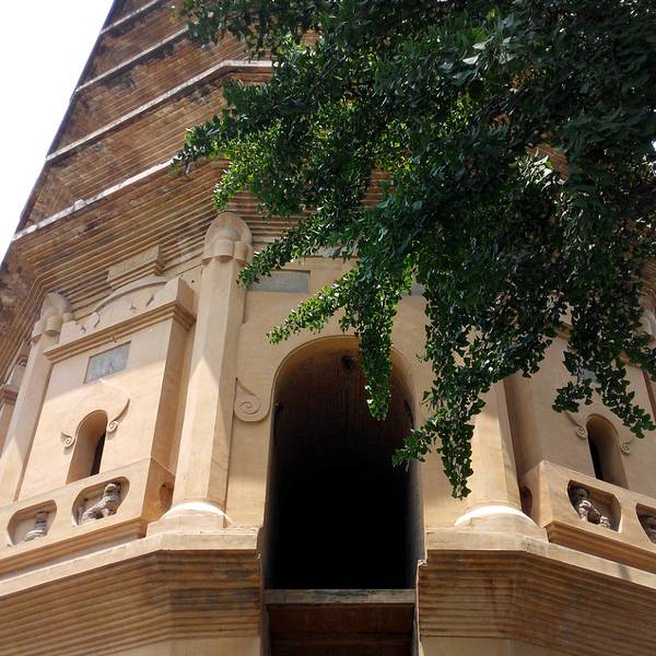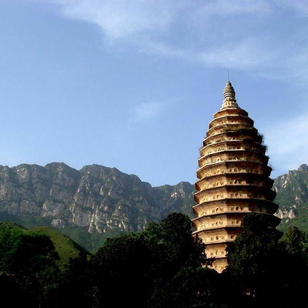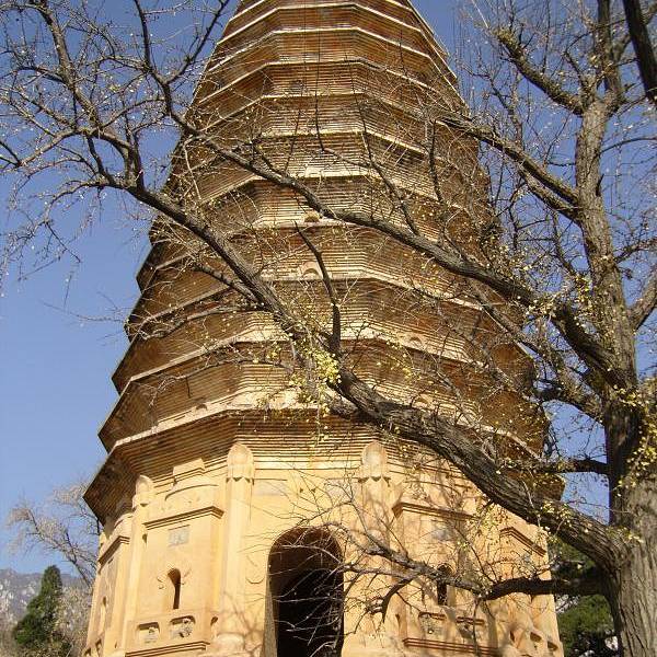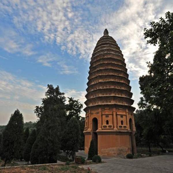 嵩岳寺塔初建于北魏正光四年(公元523年),历经1400多年风雨侵蚀,仍巍然屹立,是中国现存早的砖塔,也是全国古塔中的孤例。嵩岳寺塔为砖筑密檐式塔,也是的一座十二边形塔,其近于圆形的平面,分为上下两段的塔身,都与印度“stupa”相当接近,是密檐塔的早期形态。它保留着印度阿育王时期佛塔的特色,目前这一时期的佛塔,在印度都找不到了,许多研究印度阿育王时期佛塔的学者和专家必须要到嵩岳寺塔来。嵩岳寺塔塔高37.6米,底层直径10.16米,内径5米余,壁体厚2.5米,由基台、塔身、15层叠涩砖檐和宝刹组成。塔基随塔身砌作十二边形,东、西、南、北四面各辟一券门通向塔心室,四正面券门与下段门道通,券门上有印度式火焰券门楣,其余八面各砌出一座单层方塔形壁龛,各转角处砌壁柱。中部是十五层密叠的重檐,用砖叠涩砌出,檐宽逐层收分,外轮廓呈抛物线造型,其意匠显然来自中国的重楼,其内部则是一个砖砌大空筒,有几层木楼板。高处有砖砌塔刹,通高4.75米,以石构成,其形式为在简单台座上置俯莲覆钵,束腰及仰莲,再叠相轮七重与宝珠一枚。该塔塔心室作9层内叠涩砖檐,除底平面为十二边形外,余皆为八边形,塔下还有地宫。