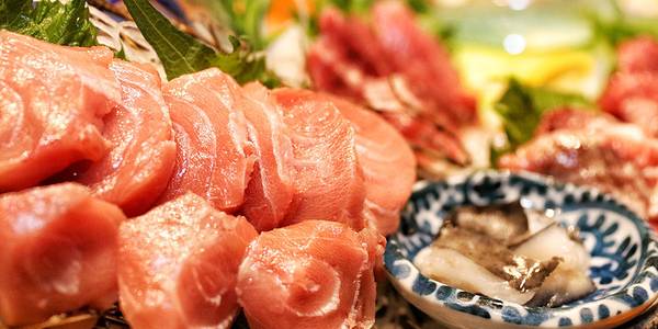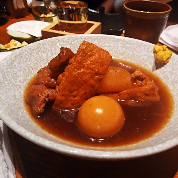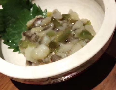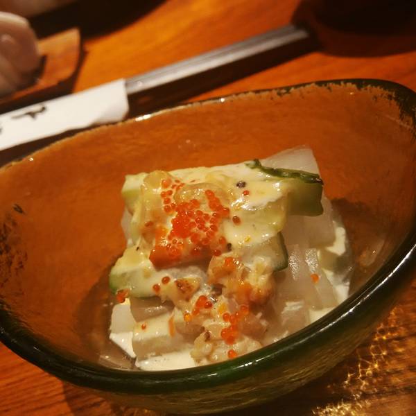 以古朴典雅的用餐环境,无雕无琢的天然食材、一丝不苟的烹调过程,素雅朴实的陶器食具,来认真对待每一位食客。 刺身拼盘包含:眼泪酒、脸颊刺身、目玉刺身、冰头刺身、脑天刺身。眼泪是蓝鳍金枪鱼的泪腺晶体,一条150公斤蓝鳍金枪鱼才出两份,弥足珍贵。用小勺取一点晶透粘液状的眼泪放入冰镇的日式清酒小酒盅里,一饮而尽。据说可以明目,喝完后有木有眼睛清亮了许多。