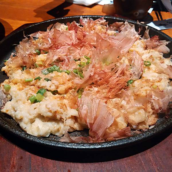 和风山药,山药做成泥装,铁板煎烤上面撒上木鱼花。门口双人桌吊灯二楼楼下的一角走廊餐具右面的碟子是放调料的盘子前菜沙拉关东煮海鲜沙拉海鲜刺身牡丹虾和风山药生牛肉西京烧鳗鱼寿司烤饭团部分菜单天妇罗饭后甜品鲍鱼