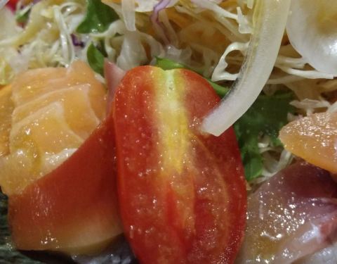 培根沙拉,竟然是最爱吃的,里面有炸的蒜片,酱汁也是特调的,味道很棒。