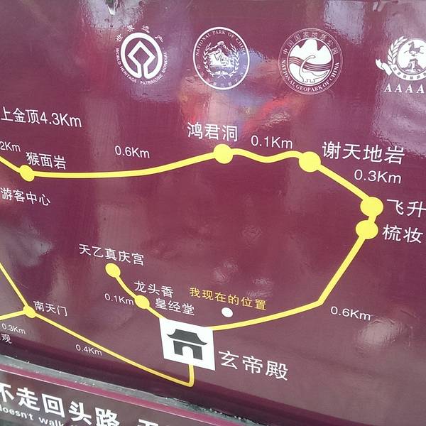“朝天宫”往下走就是“南岩宫”,“南岩宫”的绝妙之处就是“龙头香”。(具体请百度)。仔细注意导游图,我们走的是:榔梅祠-飞升岩-南岩宫(图上的玄帝殿)-南天门-乌鸦岭,一圈可不走回头路,“榔梅祠-飞升岩-南岩宫”这一段地图上标是1.8公里,当时我们也没觉得啥,可走着走着就发现一会儿上一会儿下,太费体力,而“南岩宫-南天门-乌鸦岭”则平缓的多。所以省力应该这么走,“榔梅祠直接到乌鸦岭-南天门-南岩宫-走回头路-南天门-乌鸦岭”。 展开