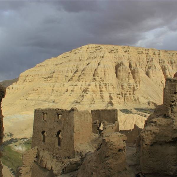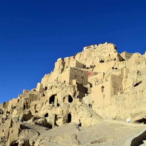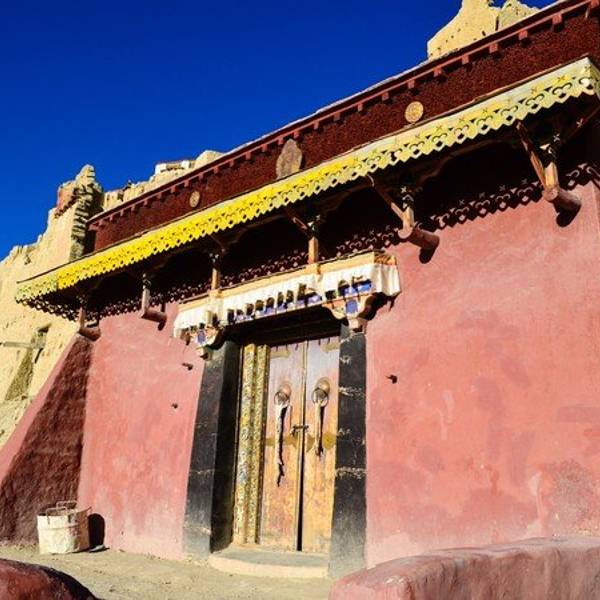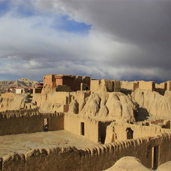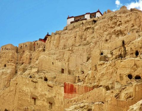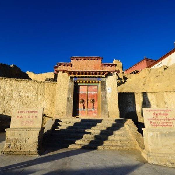 古格王国遗址位于札达县扎布让村2公里外的一座约300米高的黄土坡上,房屋建筑、佛塔和洞窟密布全山,形成一座庞大的古建筑群。遗址分上、中、下三层,依次为王宫、寺庙和民居。 古格王国于公元10世纪前半期开始建立,先后世袭了16个国王,其王宫城堡也是从10世纪开始不断扩建,并达到全盛,于17世纪吐蕃王朝瓦解后结束。遗址的外围建有城墙,四角设有碉楼,到处都是和泥土颜色一样的建筑群和洞窟,规模宏大,布局严谨,气势雄伟。 从山脚的入口沿着小径上山,半山腰有几座保存较好的寺庙建筑,分别是红殿、白殿和度母殿。殿内四壁都画满精美的壁画,画风粗犷,颜色厚重,虽经历多年色彩依旧亮丽。这些记录古格王统世系、反映古格地区政治、经济活动以及文化风情的壁画在国内十分罕见,颇具观赏和考古价值。不过这几个大殿的门平时都是锁着的,需要讲解员来开门。寺庙的周围,有十多个洞窑,其中还藏着诸如盾牌、盔甲和大刀长剑之类的古代武器。 山腰有暗道连接,沿着暗道可以直接抵达山顶的王宫。王宫有一座保存相对完好的建筑,据说是当年古格王朝的议事厅。厅内壁画主体部分大多为密宗男女双修佛,画风泼辣,用彩强烈。壁画下方淋漓尽致地展现了地狱之苦,各式刑法惨不忍睹。边饰则是一长排数十位裸空行母,妩媚优雅,仪态万方,无一雷同。 走出遗址大门,南行约几百米,沿着悬崖边的小路绕过去,有一个离地约2米高的洞口,这就是古格王国遗址中神秘的藏尸洞。洞中有洞,分三个洞厅,洞内布满腐烂掉的尸骨,据说是被当年拉达克屠杀掉的古格士兵和僧侣。奇怪的是洞中尸骨都是无头的,原因为何,至今仍是个谜。洞口有几块木条拼接的木梯,可以登上去一窥洞内风光。不过由于气候干燥,尸体没有完全腐败,散发着一种混合着酥油的怪味,无抵抗力者慎重。 游玩古格王国遗址约2小时,之后可乘车返回札达县城食宿。如果想要拍摄夕阳下的古格王国遗址,则可住在距离古格王国遗址约2公里的札布让村,村里目前有家庭旅馆可以提供食宿,不过旺季时要提前约好。