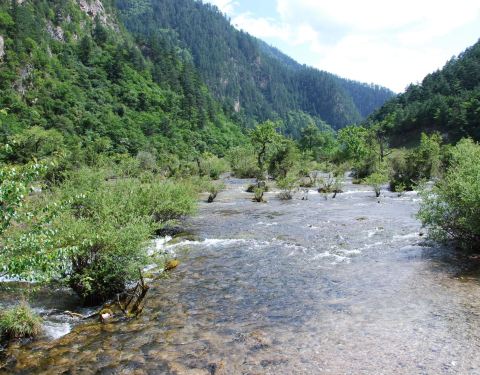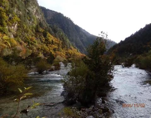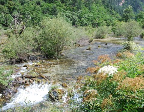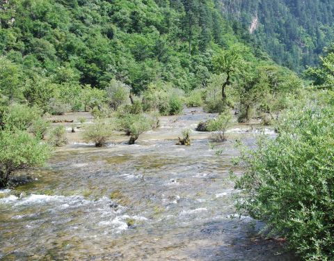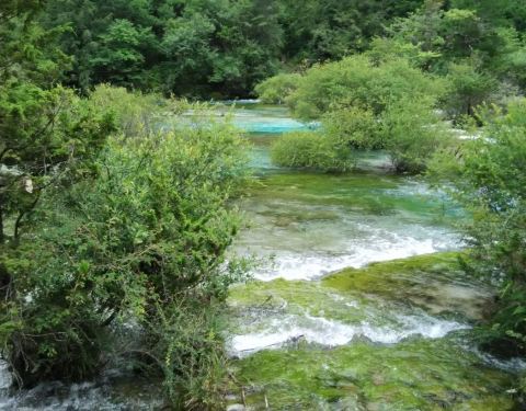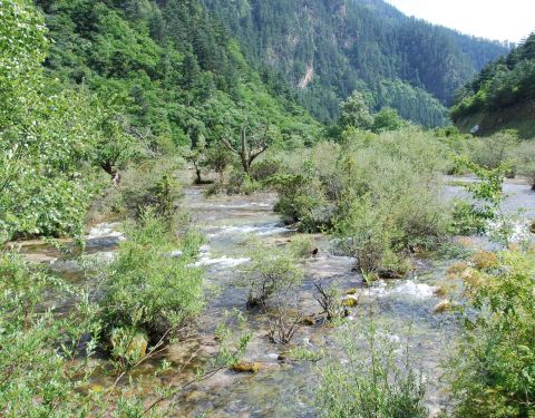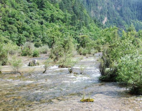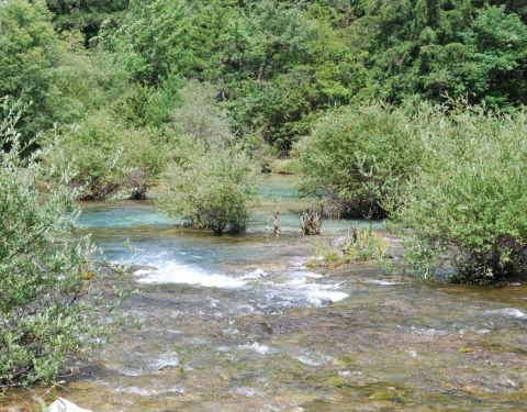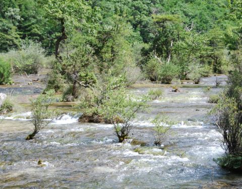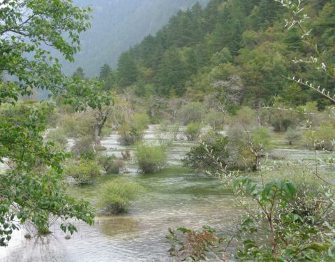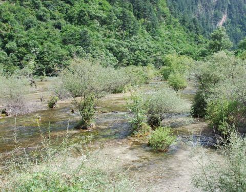 靠近九寨沟入口处,位于树正沟下方,是一处水面开阔,河床较浅的区域,由于水流较缓,河床上有很多水生灌木,犹如盆景点缀在水域中间。