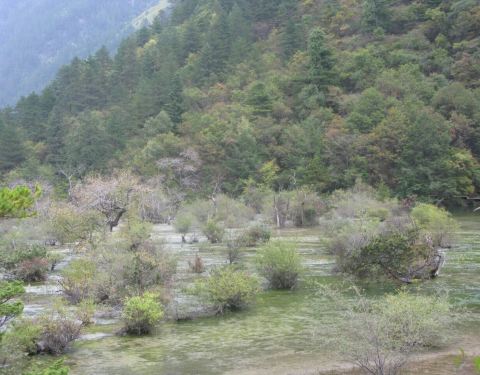 ...九寨沟景区内的一个比较特别的滩头,有各类各种的树木在水滩中或生长或枯死,如同一盆盆的盆景很好看