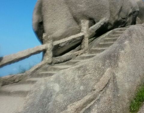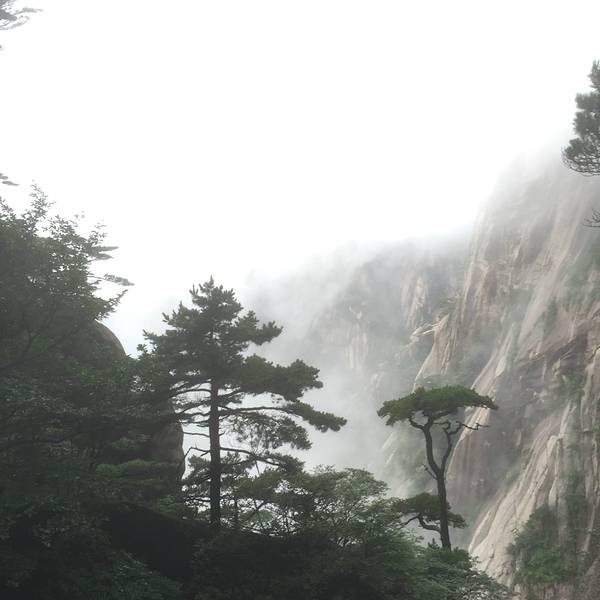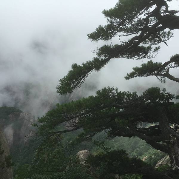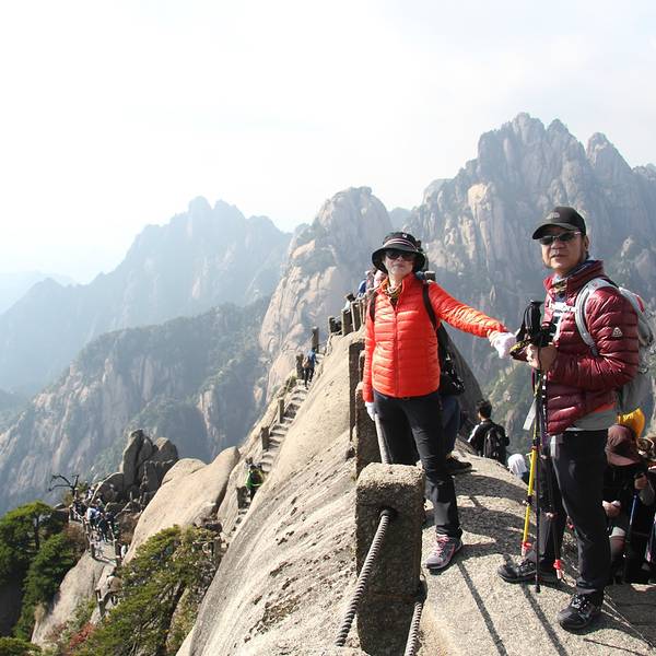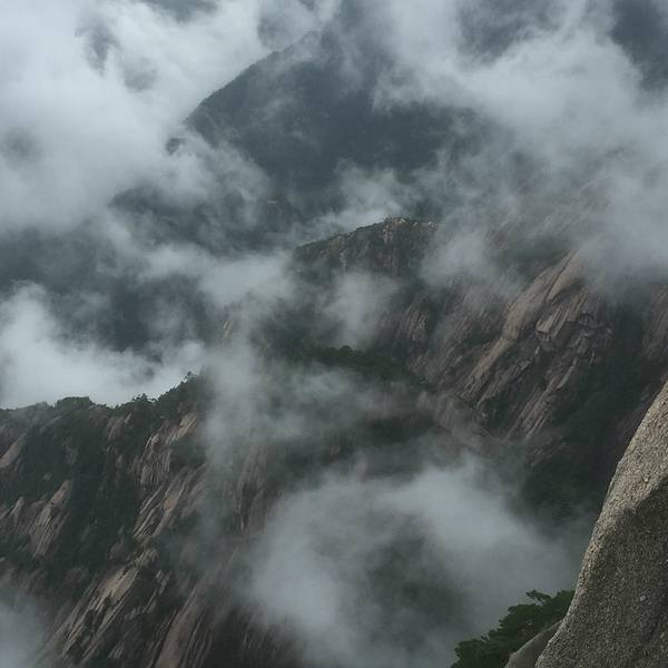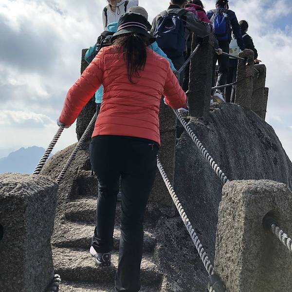 鲫鱼背上风光虽好, 但不敢久留, 走过马上就登顶了。 真是百闻不如一见, 这可真是最险最刺激的一段在这山的对面一座山登山过程中, 就远远望见了天都峰。 遥望着就能觉得是非常险的一个山峰, 给人直角上下的感觉, 非常咄咄逼人的气势。 想想山顶的鲫鱼背, 听说是只能单人通过的小道, 很窄小还两边都是悬崖,...在这山的对面一座山登山过程中, 就远远望见了天都峰。 遥望着就能觉得是非常险的一个山峰, 给人直角上下的感觉, 非常咄咄逼人的气势。 想想山顶的鲫鱼背, 听说是只能单人通过的小道, 很窄小还两边都是悬崖, 当时心里就感到有点慌, 不过还是鼓起勇气去尝试了。 一路上走来山势确实够险, 幸好靠着非常结实的绳索, 摇晃着紧拉住这根救命稻草。 登上山直到鲫鱼背处。 真是百闻不如一见, 这可真是最险最刺激的一段。 两边都是悬崖, 只有两根绳索牵在两旁, 狭窄的道路分台阶行走, 真是需要勇气。 走过去后就是天都峰顶了, 想想离终极峰顶这么近, 勇敢地开步走去了。 开步前在窄小的转弯处拍了照片, 来往行人都很有秩序, 遵守一人一过的不成文定律。 看这鲫鱼背其实路程不长, 只要有勇气, 还是可以走过去的。 当时两旁都是雾气, 丝毫看不到两边的风光, 据说天晴时, 看清两旁的万丈悬崖, 只有更让人心悬。 走时就是风大, 大得要命, 人们都要扶稳才能开步。 鲫鱼背上风光虽好, 但不敢久留, 走过马上就登顶了。 登顶后回望自己过来的路, 想想这是刺激。 看一位75岁的老太太也在走这路, 还声音洪亮一点都不累, 真是让人佩服! 展开