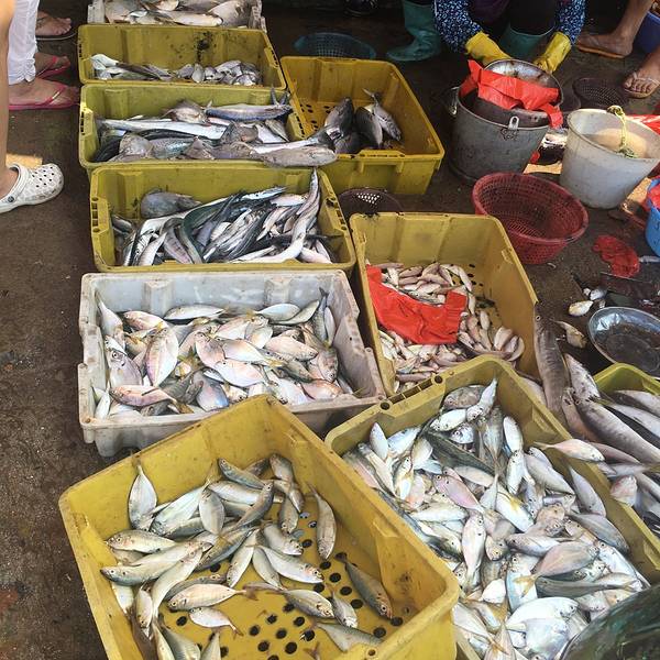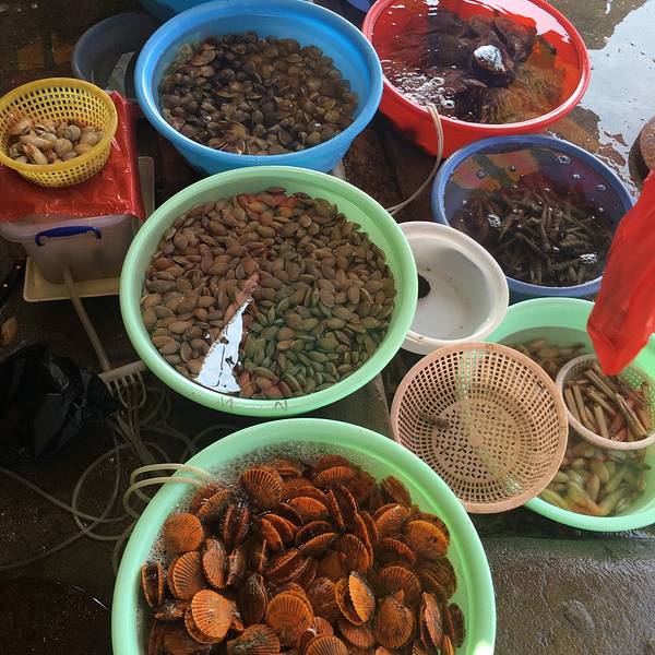 旅客们买海鲜的地方。各种鱼各种贝壳类。本地龙虾160一只
