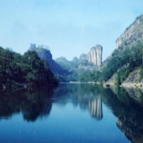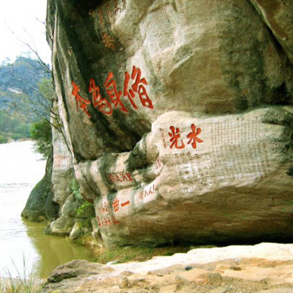 水光石上的勒字,是戚继光奉召北上,抗击强敌,守卫北疆,结束了他在东南沿海十余年的戎马生涯,在途经崇安时,身着角巾布袍,兴致勃勃地游览了武夷山,勒字于石,慷慨激昂发出了“既南靖岛夷,便当北平胡虏。”的誓言,表达了为国戍边的雄心壮志,同时也抒发了对祖国山河的眷恋之情,充满了爱国主义的雄心大志。水光渡口是止止庵与一曲诸景的交通要道,古时,很有一番兴盛。石顶上有水光亭,现辟有观景台,以让游人享受天然之趣。