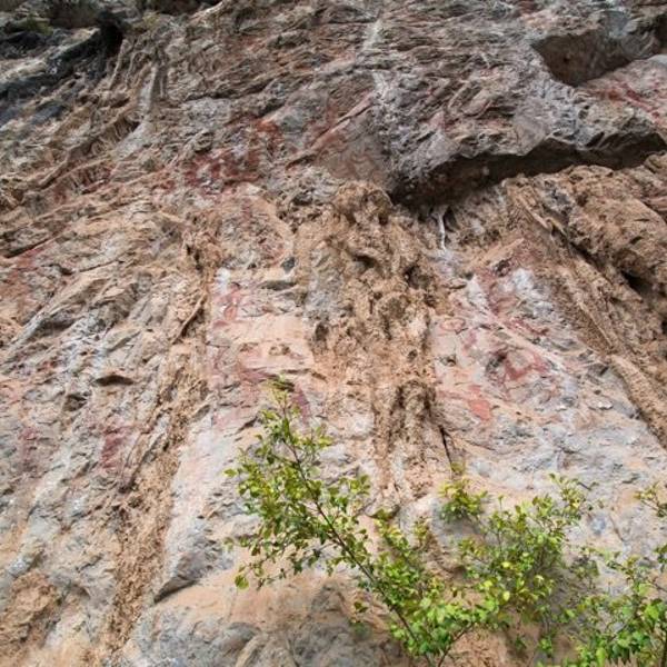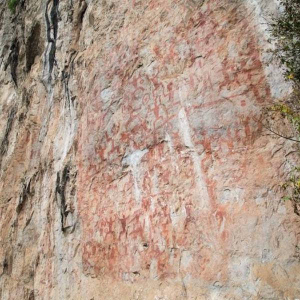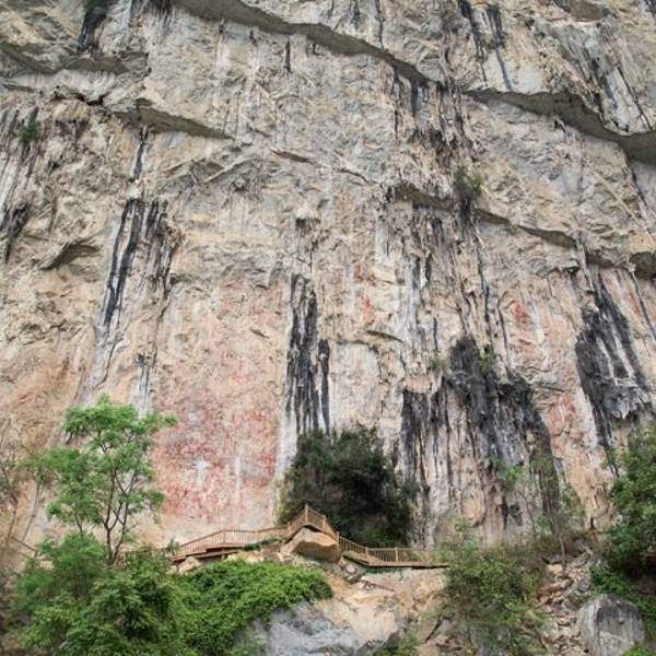 左江沿岸200多公里长的陡峭崖壁上,有着规模巨大的原始崖壁画群。整个画群分为79个点、178处、287组。其中宁明花山壁画是画群中画幅最大、图象最多、分布最密、形象最高大的一幅,可谓左江原始崖壁画之王,是左江原始崖壁画的代表作,故人们把左江沿岸的崖壁画统称为花山崖壁画。宁明花山崖壁画绘制在宁明县明江东岸海拔345米、相对高度250米、长约290米的花山悬崖峭壁口上,画面宽约150米,高约95米,画有各种图象约1800个。这些图象多为人像,也有动物和器具,画中人物形态各异,基本由“大”字变化成形,只粗画体态,不细描五官。人像周围有单层或双层圆圈,象征太阳和月亮......整个画面布局工整,繁而不乱,均衡对称,结构严谨;画像简单生动,古朴而原始。据考证,崖壁画始画于春秋,延至后汉,距今约一千八百年至四千年,它不仅是壮族先民和中国的文化遗产,也是世界崖画中的珍宝。花山壁画的主题、内容、颜色原料成分和如何绘制等这些至今还是一个不解之谜,它巨大的艺术价值和重要的历史价值吸引了众多的专家学者前来考察、研究,也已经被列为国家重点文物保护单位。