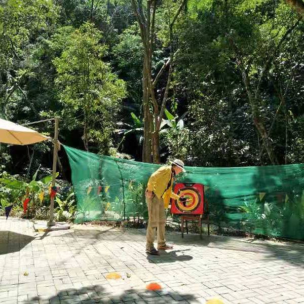 一进景区,“岭主邀你来巡山”的道旗迎面而来,有点儿意思。景区入口我们来巡山喽进来的时候差不多11点了,所以我们计划搭乘电瓶车,再步行游览,景区的工作人员热情的邀请我们参加“景点打卡”,卡片上标明园内十个景点的名称 ,每个点需要有工作人员盖章确认,全部打卡完毕后有惊喜小礼物,于是,愉快的开始“打卡”之旅......各位乘客,请系好安全带一进入山间,马上就凉快了,很舒服,落车点下车后,一行人溜溜达达顺着溪流的方向,寻找打卡点。哈哈,好玩路过一个射击点,饶有兴趣的进去玩了几下,教练细心指点后,就靠自己发挥啦,小盆友可以站在圈内射击,大盆友可要在圈外噢!