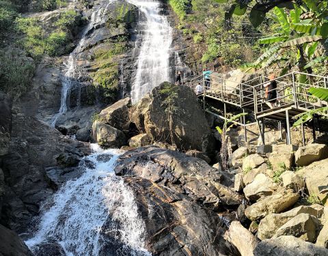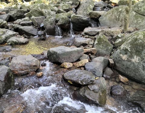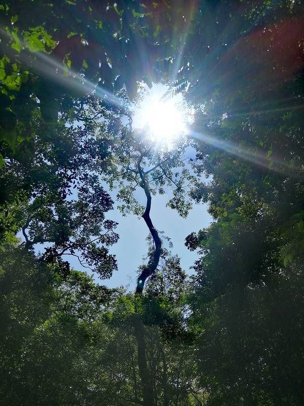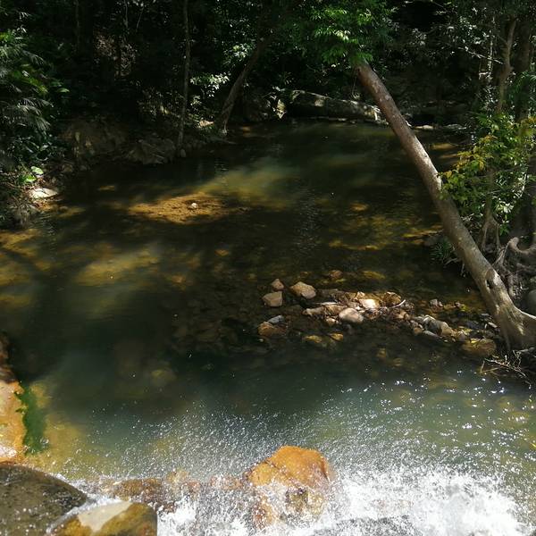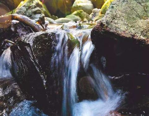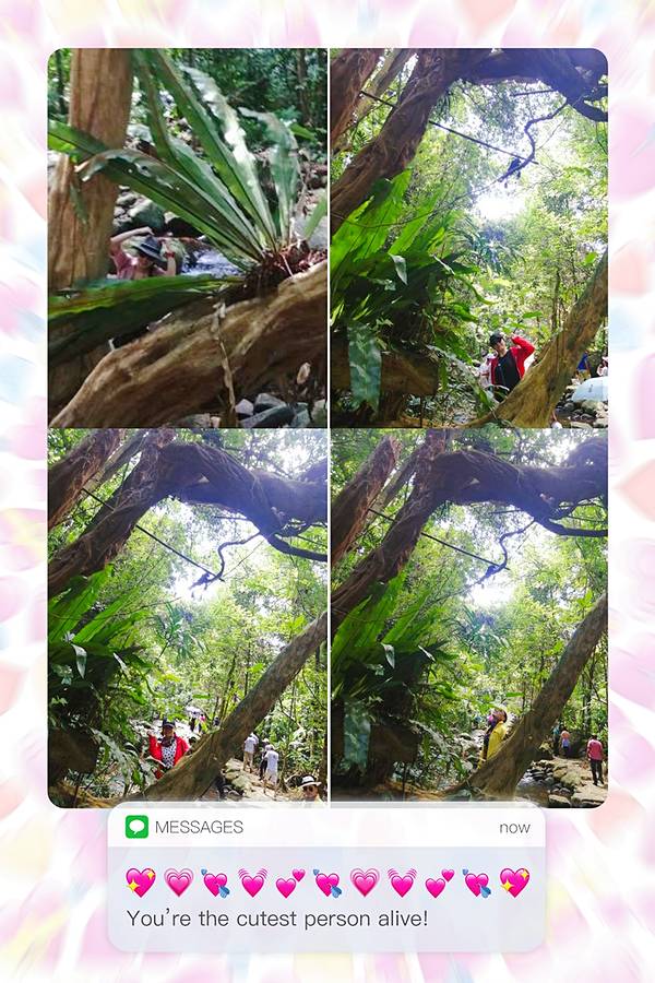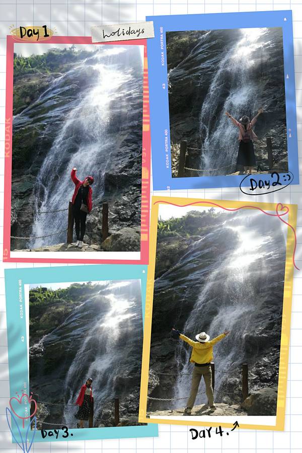 这一段路,有点晒,向上的步道,也是有点累了吧,走走停停的,躲躲阳光,瀑布并不是很大,但挺长,在阳光下闪闪发光,飘逸而下,飞扬的水花,洒在我们的身上,阳光下五彩缤纷的,甚是好看!看完瀑布往下走的时候,我们选了溪边的另一路,相对没有那么晒,舒服了很多!