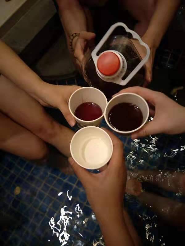 行程大概两个小时多一点,下山的时候路过百花廊桥,美美的摆拍了一组!百花廊桥跳起来!蹦起来!呀,大长腿!飞起来!回程路上的云彩也好漂亮,五指山路段还下了一阵雨,这一段路也是盘山路,来往的车辆不少呢!金光万丈像不像小时候吃的宝塔糖?晚上住的是“中南温泉公寓酒店”,每栋别墅有四套房,楼上楼下各两间,都是一房一厅的别墅套房,我们住在左侧的楼上楼下,室内都有独立的温泉泡池,爬完山的疲惫,泡泡温泉是非常舒服的! 大堂门口的三角梅开的太好看了,很绚丽!园区一角拍夕阳西下吃饭的地方朋友推荐去“脏鸭子农家乐”,离我们住酒店2公里多一点,用餐环境很好,小桥流水人家的感觉,最好吃的烤鸡当然要来一只啦,闻着味儿找过来,一只只色泽金黄的烤鸡在炭火上翻腾,太有食欲了!我们还点了干锅黄骨鱼,菌煲等五个菜,再配一杯当地产的糯米酒,简直了!(景区的价格是贵一点的,人均消费120,国庆期间菜价也略略的提了一点,美团等平台的优惠也是不能使用的;也可以开车去保亭吃饭,相对便宜些)其他菜忘拍照了,太家都饿了回酒店后舒舒服服的泡着温泉,喝杯山兰酒,("山兰米"是海南特有的品种,呈现紫红色)美美的睡一觉,明天早起要跑步了!当地的朋友留了一桶给我 展开