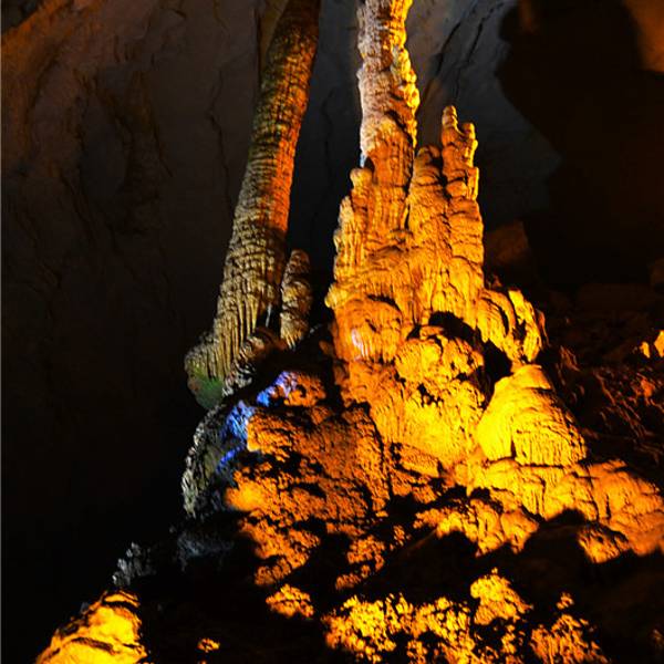 洞里有地下暗河,可以乘船十几分钟,欣赏里面的景色。洞里还有一座龙宫,是石柱石笋最聚集的地方,很漂亮。龙宫里有一根“定海神针”,一根高约20米,两端粗,中间细,最细处直径只有10厘米的钟乳石柱,据推算已生长了二十万年,景区为此投保了一亿元保险金。