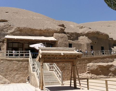 四周被几乎寸草不生的戈壁、荒漠所包围,惟独紧贴石窟外围的狭长地带上长满了一排排高大、茂盛的青杨或白杨树。这是为保护文物而人工栽种的,形成一个戈壁小绿洲,构筑成一道天然屏风使干燥的石窟免遭风沙的侵蚀...