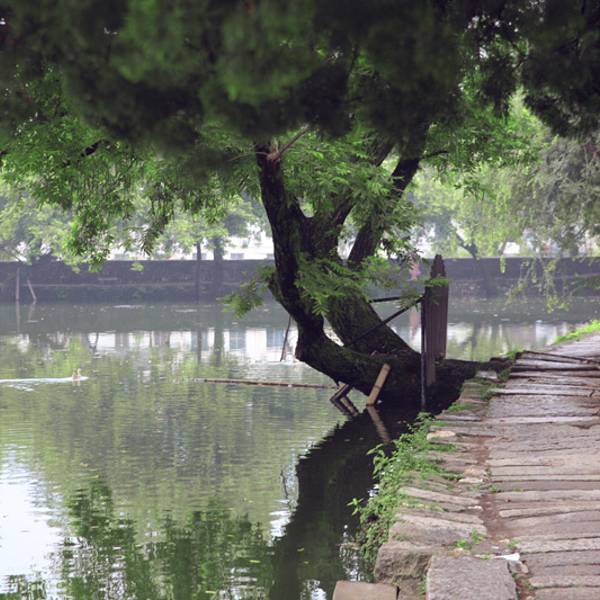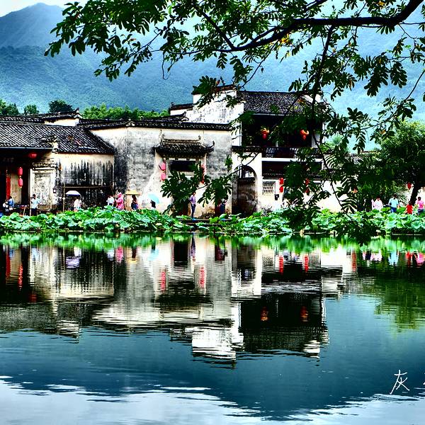 其实,南湖水没有看上去那么干净,有点脏,比较破坏美感。可能是由于越来越多学生来画画,就在水里洗颜料,导致水变脏。南湖,便是牛的肚宏村最标致的景色,没有之一。阳光充足时,水面波光粼粼的倒影与岸边建筑连成一片,如诗如画。如果说月沼是泼墨画的话,南湖就是中国粉彩画,山、水、桥、屋浑然一体,让人置身于画中,有一种朦朦胧胧感觉,有点不知所云了。我很喜欢这种平静、安详的感觉,就这样看着,心里都很舒服,生活中有许多不开心,但此时此刻我不再浮躁,我好像看到了自己,在和另一个自己对话。这里就是站在拱桥上,向远处眺望,青山绿水,白墙黑瓦,荷叶,倒映,很美!南湖的一湾好水如镜般澄明,把沿岸的古民居、书院、画桥尽皆映摄入湖,随目望去就是一幅展开的水墨长卷,合着含烟的远山,真正诉不尽的青山隐隐,流水沼沼。时间很快,在宏村的时间的也是有限的,最晚班车是下午4点,最后还是依依不舍的离开了。 展开