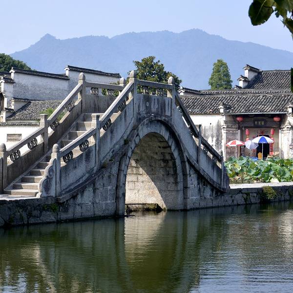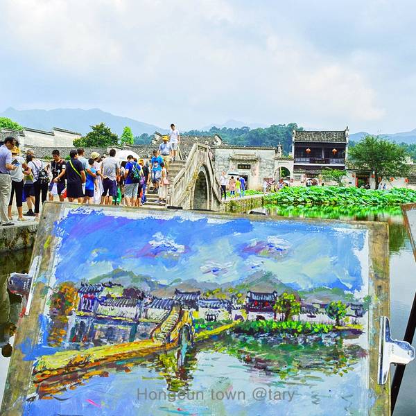 当你一走进宏村,你看到的就是南湖,南湖在村口,像一把弓,对面是弦,这座桥就是准备射出去的箭。湖边会有许多美术学院的学生写生,在湖的中心位置有一个拱桥,当你走到拱桥上环顾四周的时候,这一切真的是太美了,像是身在画中。