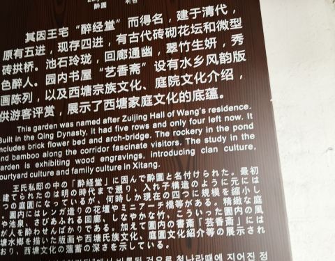 醉园面积虽然面积不大,但园内景致引人,是江南园林建筑之精品。 第二醉是指园内景色醉人醉园位于西唐镇塔湾街31号,初建于明代,原有五进院落,是西塘望族王氏塔湾街宅院之偏厅,现存四进。园主的版画工作室设在醉园深处。 醉园有三醉,第一醉是指“醉经堂”,取醉读经书之意,寄托了望子孙后代皆能沉...醉园位于西唐镇塔湾街31号,初建于明代,原有五进院落,是西塘望族王氏塔湾街宅院之偏厅,现存四进。园主的版画工作室设在醉园深处。 醉园有三醉,第一醉是指“醉经堂”,取醉读经书之意,寄托了望子孙后代皆能沉醉于这诗书经典之中的厚望。宅院修建者王氏世祖王志熙为乾隆年间的书画家,攻楷、行、草,擅诗、画,可谓是书香门第之家。 第二醉是指园内景色醉人。 醉园面积虽然面积不大,但园内景致引人,是江南园林建筑之精品。 第三醉是指宅院主人沉醉于版画艺术。在醉园最深处有个版画工作室,同时也是园主王亨先生的住所。 作为一名版画家,房间里满满陈列着他与儿子王小峥的西塘水乡风光版画作品。 如今已是耄耋之年的王亨先生,仍然每日笔耕不辍。有缘人可带走一幅画当做西塘的纪念品,价格还是十分公道的。 展开
