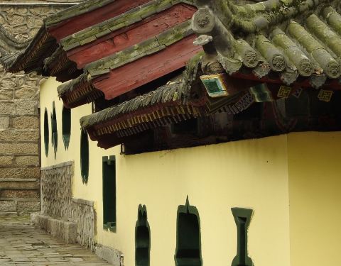 从这个回廊的中门过去就是一个平台上面一个亭子,然后就进入华山的路了! 展开