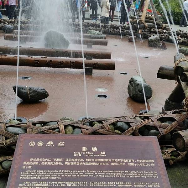 到了都江堰,不得不由衷的佩服李冰父子!相传李冰建堰时在内江河床下埋有石马,作为每年淘滩深度的标准,后来演变为卧铁。卧铁与“深淘滩、低作堰”的6字水则,以及“遇湾截角,逢正抽心”的8字格言,是都江堰岁修淘滩的尺度。清淤时必须淘够深度,以淘至见到卧铁为准,如果淘滩深度不够,内江河床太高,将减少成都平原来年春灌引水量,而如果淘滩过深,则会使过量的洪水涌入内江,导致内江灌区洪涝灾害。卧铁至今留存4根,最早铸于明代万历三年(1575年),由四川御使巡按郭庄主持铸置。