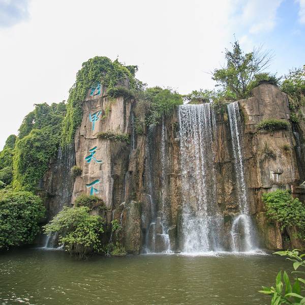 秀甲瀑布是迎宾广场的主体建筑之一。游客来此,都要在瀑布前面合个影秀甲瀑布是迎宾广场的主体建筑之一。“秀甲天下”浓缩了“峨眉天下秀”这一定论,一个“甲”字突出了峨眉秀色的地位和峨眉山人的气魄。游客来此,都要在瀑布前面合个影。