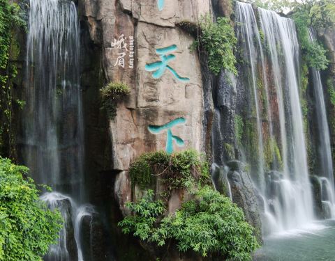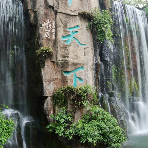 这是一处人为景观,和自然形成的瀑布相比还是有差别,但是气势绝对足够,立于瀑布前,只见飞瀑泻来,一条白练悬挂于石壁上,飞溅的水花在空中形成雨雾,“秀甲天下”也正浓缩了“峨眉天下秀”这一定论。