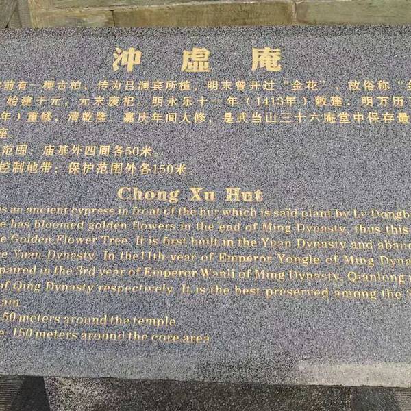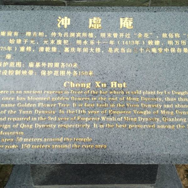景点真的很赞额,推荐大家也都去玩玩。由于来此的人不多,所以环境非常清幽。不过沒有完全修复景点真的很赞额,推荐大家也都去玩玩。由于武当山主要体现了皇权和神权的结合,所以建筑也是分等级排列的,而庵堂作为修道之人修身养性的场所,在其中的级别并不算高。冲虚庵是武当山36座庵堂建筑中保存最为完好...景点真的很赞额,推荐大家也都去玩玩。由于武当山主要体现了皇权和神权的结合,所以建筑也是分等级排列的,而庵堂作为修道之人修身养性的场所,在其中的级别并不算高。冲虚庵是武当山36座庵堂建筑中保存最为完好的一座。距离玄岳门很近,向北行约十分钟可到。如果顺路的话可以过去看看,但不必专程前往,道观的地方不大,现存祖师殿、皇经楼、吕祖楼、三官阁等建筑。不过沒有完全修复。虽然如此,真个庵堂却颇有些古意。门口有一棵古柏,传说为唐吕洞宾所植,虬枝蟠屈,每到夏季,满树开花,故名金花树,为武当山奇胜之一。院中还有一口古井,名为舜井。由于来此的人不多,所以环境非常清幽。 展开 2015-03-29 13:20