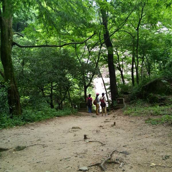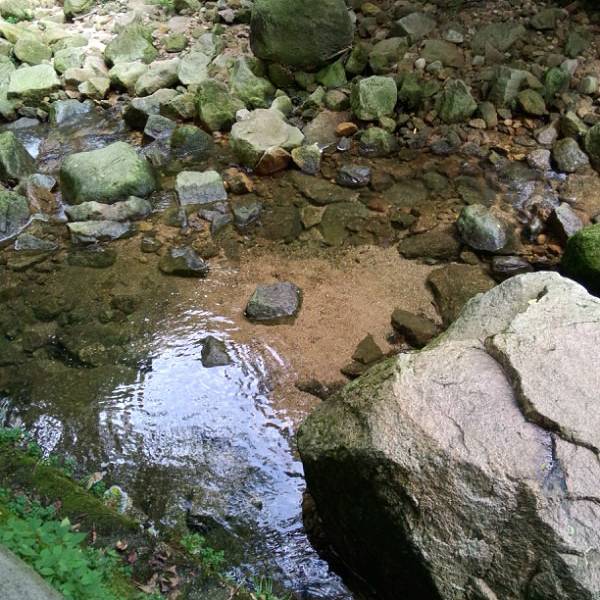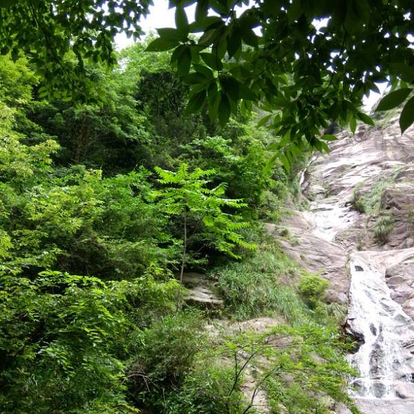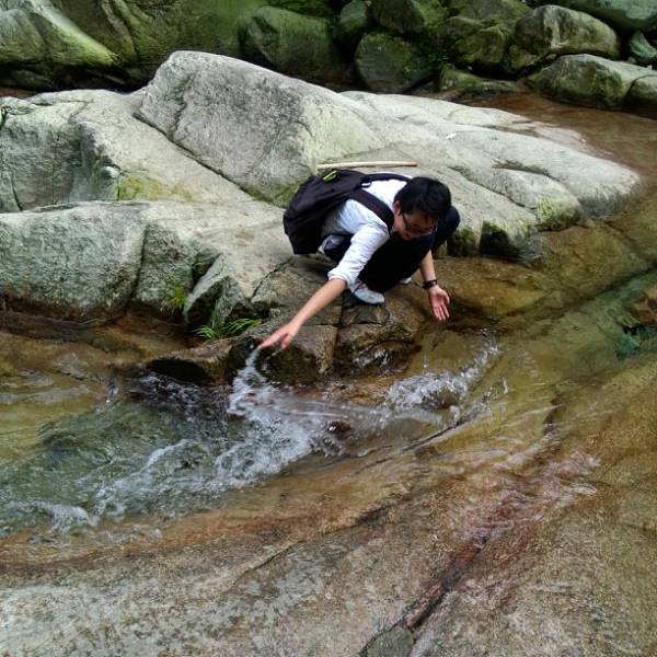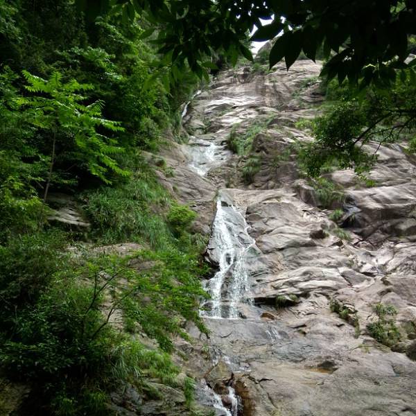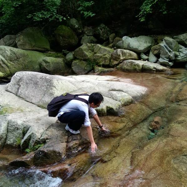 我们是直接从慈光阁那条路一路下来,导游在后面,我们先到了就先玩了一会。人字瀑不高,从顶端流下之后一颗石头将其分成两股流水,成“人”字状。瀑布的水都是黄山山顶流下来的水,清凉无比,洁净无比。底下的小溪比较宽,倒不如说像是个潭,水清澈见底,可以看见水下的石头,水真的清到你想喝。不知道为什么,这一片水域总是给人想下水的诱惑(当然,我们去的时候是夏天)。周围树木参天,郁郁葱葱,不时有鸟叫传来,实在幽静,真的都想在这附近搭个小草棚,学古人隐居的生活,倒也是美啊!