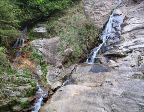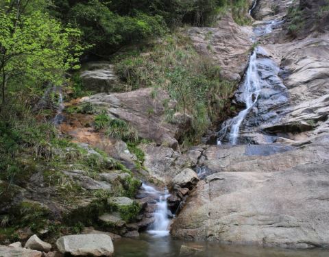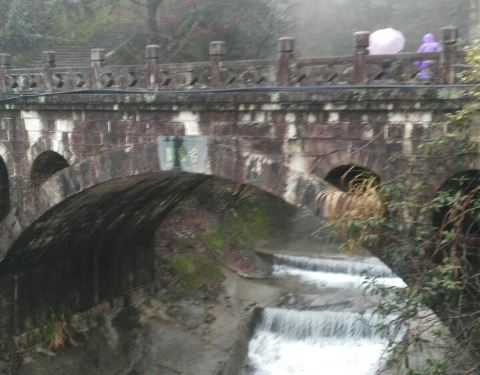 古名"飞雨来",位于温泉旁紫石、朱砂两峰之间,海拔660米,一源二流,形似"人"字,而得名。
