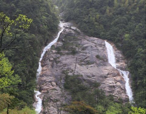 位于温泉旁紫石、朱砂两峰之间,海拔660米,一源二流,形似人字,而得名位于温泉旁紫石、朱砂两峰之间,海拔660米,一源二流,形似人字,而得名。又因像两条白龙飞流直下,而有双龙飞瀑之称。因背后就是摩天接日的天都峰,故人们又称它为天都瀑布。