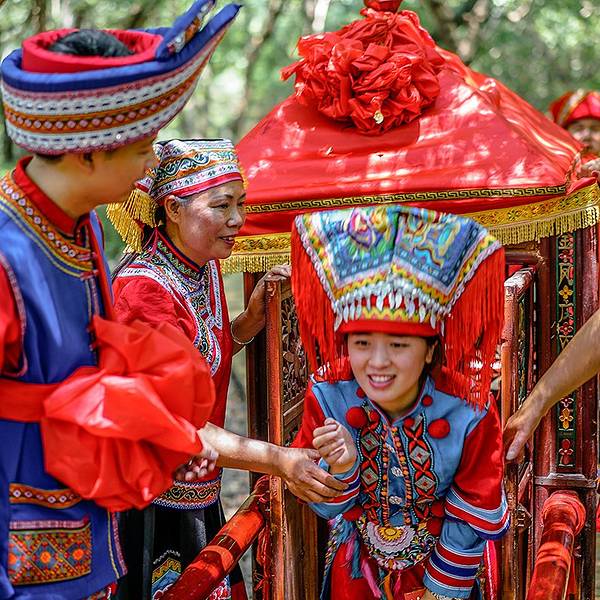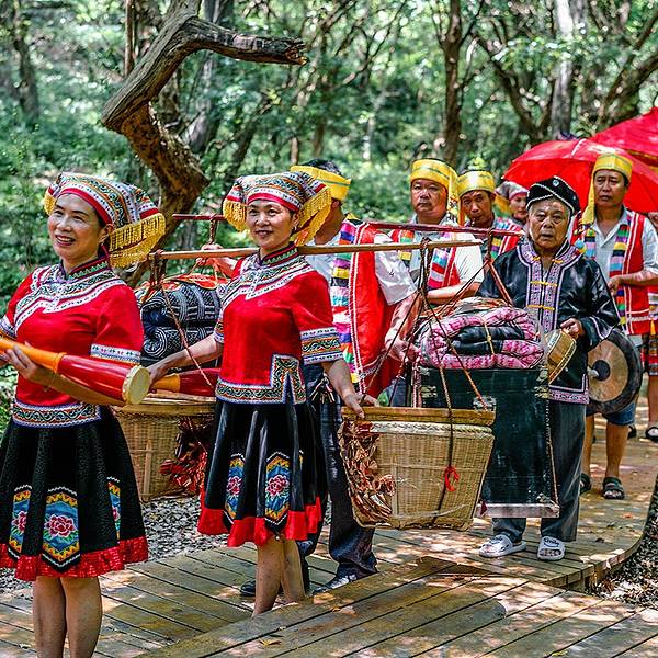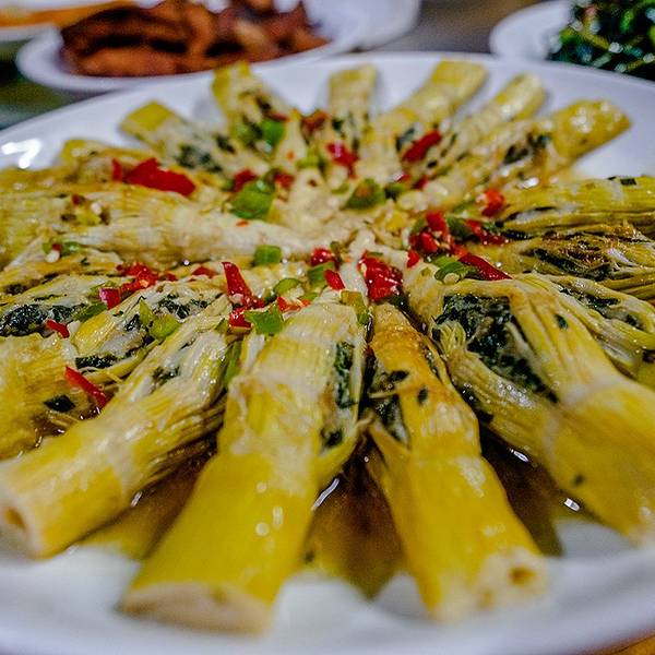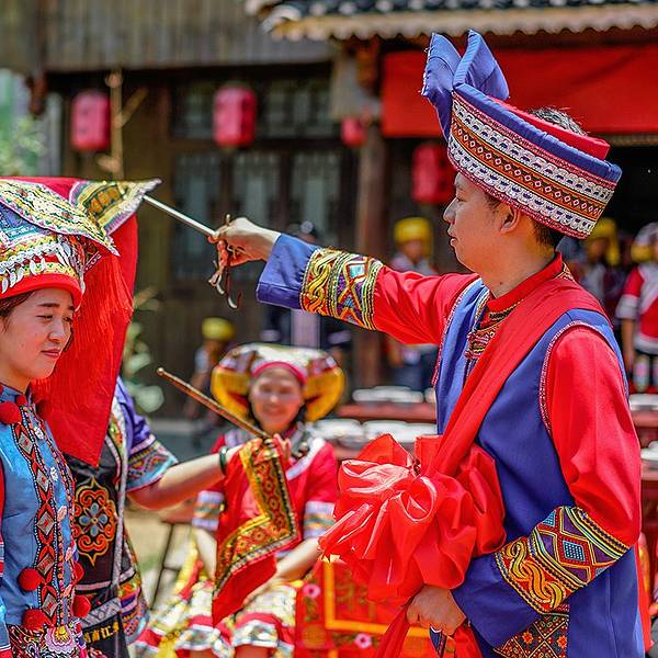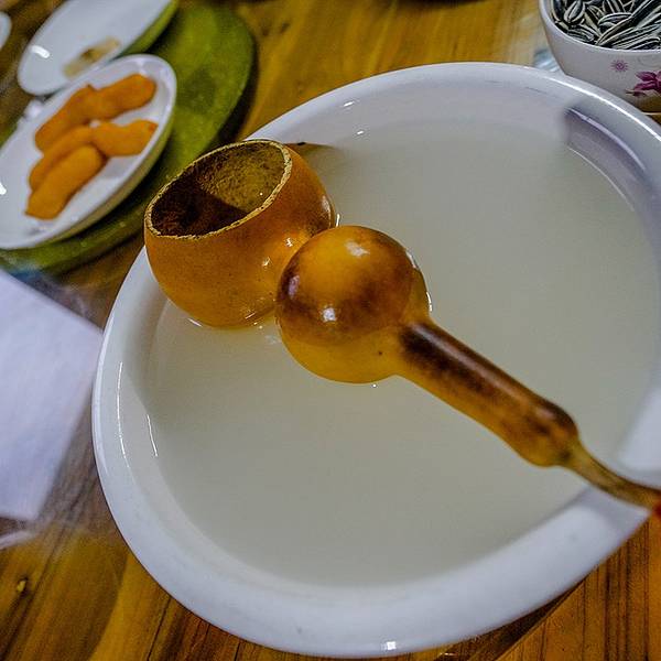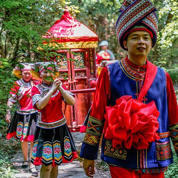 我们从回龙圩向东行驶,来到 江华 瑶族自治县境内,在县城附近的 九龙 井原始生态园吃农家乐,这里据说有原生态的瑶族婚庆排演,所以特地过来欣赏。据说瑶族地区也兴起过西式白色婚纱的婚礼,不过近年来,又有不少年轻瑶族情侣开始恢复老式的瑶族婚礼了,所以当地的瑶族传统婚礼兴旺,这次就遇到了一对准新人,在这里排练瑶族婚礼仪式,仪式内容较多,看点不少。这场婚礼是平地瑶形式的,不同地区的瑶族婚礼都有差异,因为是瑶族婚礼演练,所以具体可能和古老真实的婚嫁场景还有区别,所以只能说一下目前看到的印象较深瑶族婚嫁习俗。接亲仪式的开场是新娘母亲的哭嫁(有些地方是新娘哭,有些亲友哭)。在过去,少女出嫁前根本不知道对象是谁,直到结婚当晚才能见到,完全像在赌自己将来的命运,故有了哭嫁的习俗。迎娶的队伍一路载歌载舞,抬着轿子前行,瑶族特色的长鼓舞是喜庆队伍的主体。新郎迎娶新娘之后,会有分红包、开轿门、挑红盖头、叩拜等内容,不过让我好奇的是,如果是入赘女方家,那婚礼仪式应该是如何样子的,可惜的是这场婚礼是男娶女。瑶族的婚庆上,水酒 和美 食必不可少,这里的水酒采用大盆装,用葫芦瓢盛酒,一般都需要以3为单位敬酒,不喝三杯、三碗过不了关。瑶族水酒甜甜的度数不高,只是不要太贪杯了,因为后劲还是很足的。瑶族的饮食文化深厚,来这里不可不多尝试一些,瑶家的“十八酿”,豆腐酿、辣椒酿、竹笋酿、香菇酿等等,不同的酿代表不同的祝福,视觉和味觉的同步享受,各种各样名目的粑粑,也会让你回味赞叹不已。“圣水”豆腐丸,我觉得是 江华 的一 大名 菜,属于“瑶家十八酿” 之一。其制作方法是将精肉剁碎,以香葱、香油、精盐、味精等拌合,先做成馅,然后放入挖有空洞的鲜豆腐中间,再贴锅黄焖至熟即成。据说这道菜是考准女婿和考准媳妇的必修科目。男方上面提亲,需要筷子夹豆腐起来,碎了就娶不到了,如果丈母娘看中准女婿,就把豆腐煮老,如果看不上,就给很嫩的豆腐;而女孩子烧的好这道菜,说明手艺和心思巧,这是瑶家婚嫁入门测试的一道名菜。