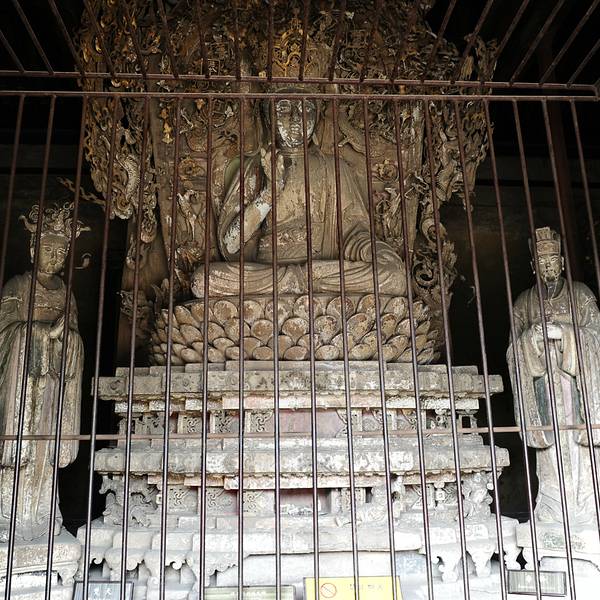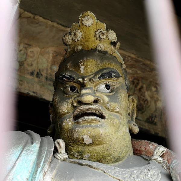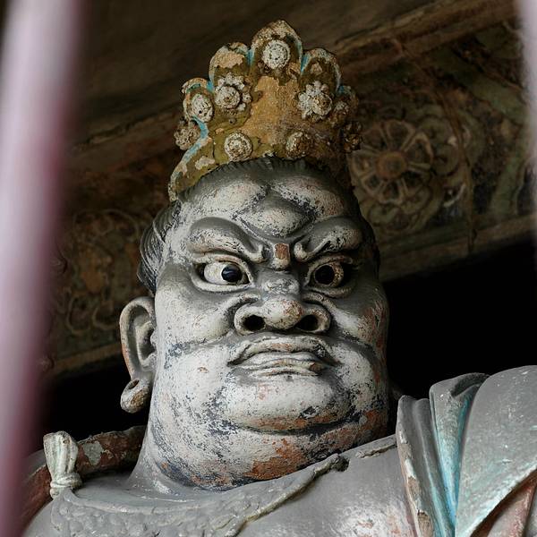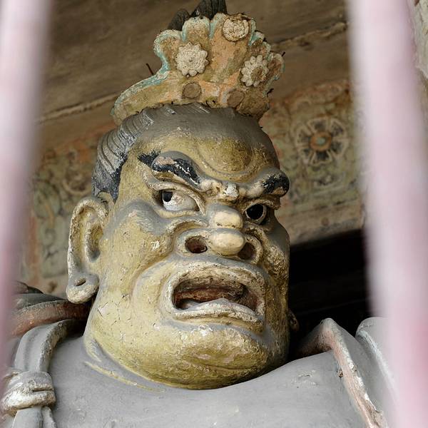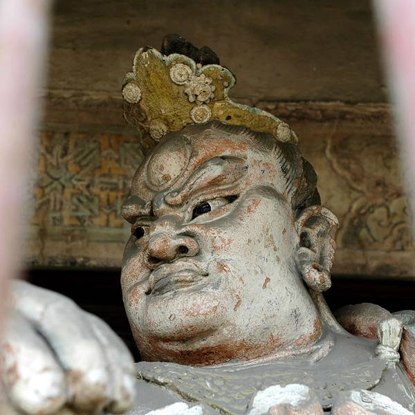 天王殿廊檐下塑四大金刚,每尊约高三米,一字排开。屋顶悬山式,满布灰瓦,整个建筑风格 质朴简洁