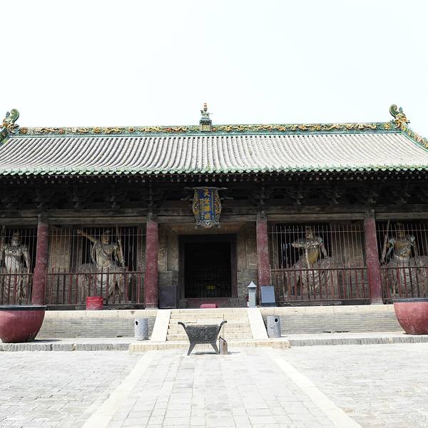 天王殿建于元代,几经修葺,但仍保持了元代的风格,单檐悬山式建筑面阔进深各三间,进入殿内,即可参谒天王殿诸神,殿的中央原塑有身材魁梧的关公塑像,两侧是佛国护法神将------四大天王。它们全是清代重塑作品,象征着民间老百姓期盼“五谷丰登,天下太平”的美好愿望。