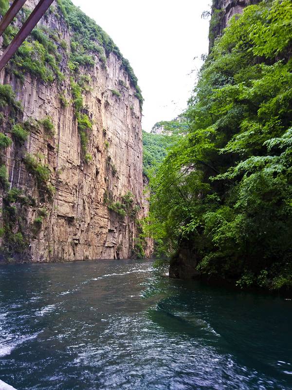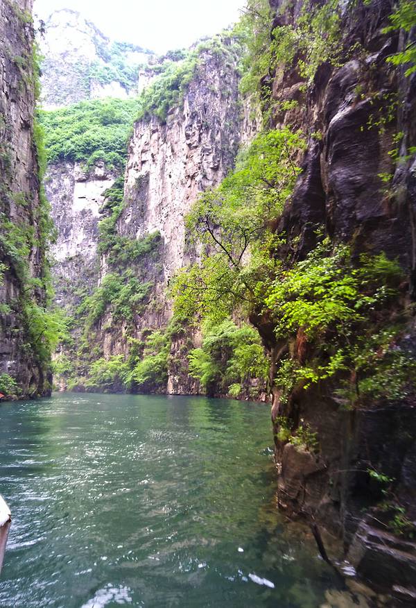 我们站在八泉峡售票处的牌子前,对照地图研究几分钟后,毫不犹豫的买了全套票。进入景区,还有小食品店和饭馆,雨还在下,不着急,吃个25元的盖浇饭。先乘电瓶车到达码头,这里已是高山平湖了,两侧高高的峡谷,一弯静静的碧水环绕,小雨中清丽无比。两侧峭壁高峻,一线天际曲折婉转,倒映在水中,清幽雅静。与一个单位的几十人混在一起乘船,虽是雨天这景区游人也不是很少。船缓缓地行驶狭窄的水面上,画卷徐徐展开,两侧青山绝壁,直插天穹,要高高扬起头才可见到天空,这景色还真是让人兴奋。大约十几分钟下船。哟,小雨不下了。