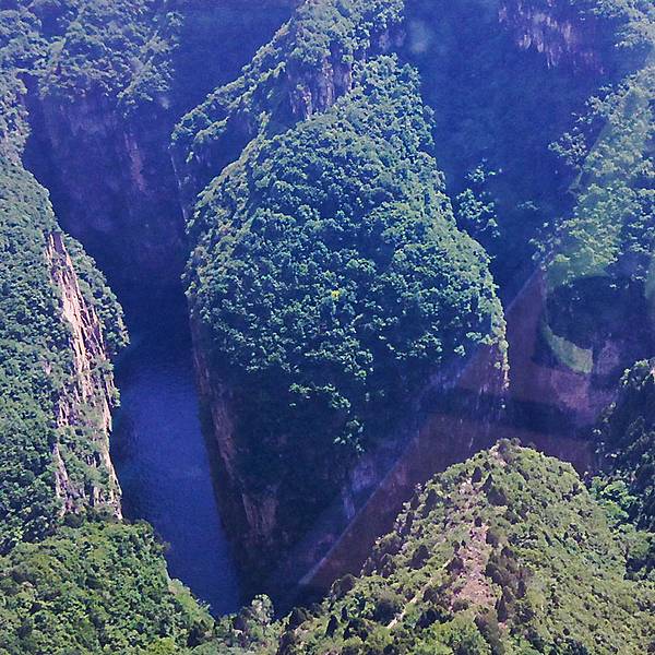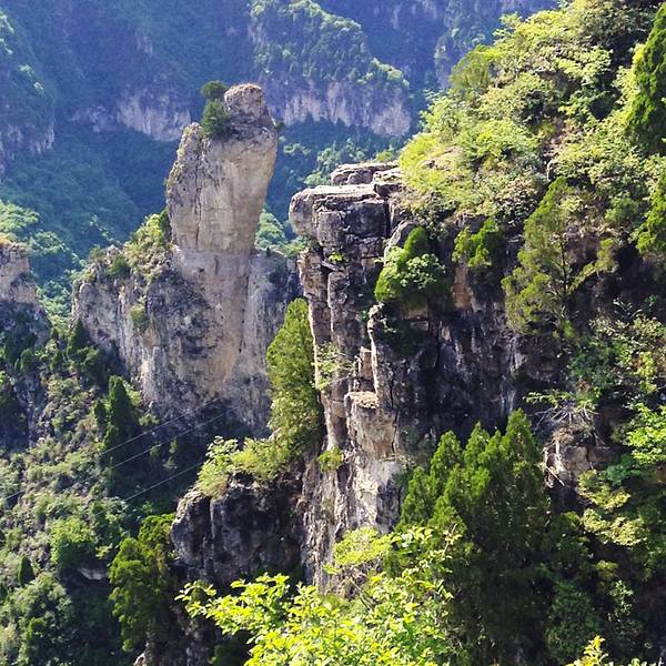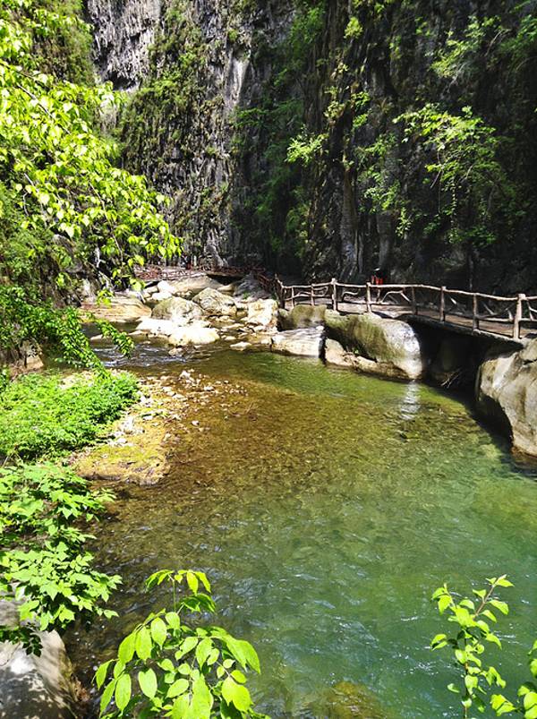 开始沿蜿蜒曲徊的峡谷穿越,小溪潺潺,碧潭不断,没一会儿太阳出来了,正午的阳光完全打在峡谷中,非常难得,就是费尽心思打算也真未必有如此精准的游览佳境。心情大好,虽没有单反,手机拍摄也不错,眼睛和心灵的享受更重要。慢慢走,尽情享受这一时刻美好和清新,耸立石峰间伴着悠悠的水声,体味仙境般的美好,真是“幽谷翠峰梦中寻”呀。一小时左右到达缆车站,可能由于票价太高,只见缆车走而不见有人坐,一起上船并游览的单位人员,只坐在缆车站前休息,不见上车。