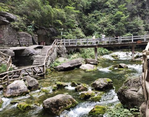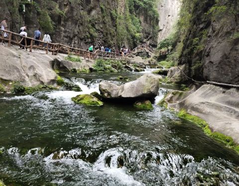 进入景区后,先剩环保车到坐船的地方坐船,游览一段水路后下船徒步,行走在小溪的两边,欣赏峡谷的美景,峡谷里的水很清,仔细看看能看见有很多鱼,悠哉悠哉地一路向前,大概一小时到达坐缆车的地方坐缆车上山顶,在山顶目睹整个峡谷的面貌,然后步行一段路到达“天空之城”这算有三层楼,都是玻璃的,中间那层有凳子可以坐,鞋套是免费的(不是一次性)然后最低下可以坐电梯到下面换乘环保车回到景区大门,就这样玩了半天,不赶时间的建议慢悠悠玩