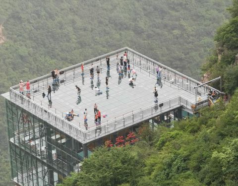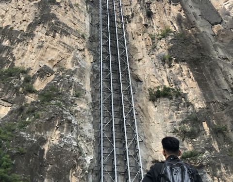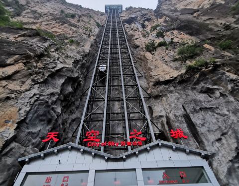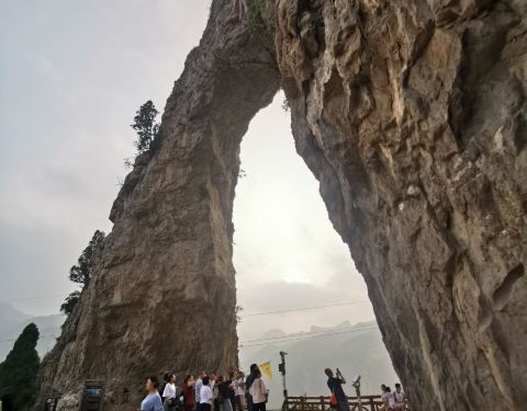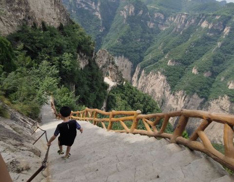 上了全封闭的缆车,只有我两个人,慢慢向上,好高好长,在缆车上向下欣赏大峡谷全貌,刚才乘船的高山平湖,步行的峡谷小溪,如同一幅泼墨长卷,将峡谷气势、山泉飞瀑、激流浪花、奇峰异石浓缩于脚下,形成一幅巨大的太行山大峡谷风景画。索道缆车把山峦连起来,把远山近景串起来,坐在上面大有俯瞰百重山,遥看一千河之感。那北天门不知不觉迎面而来,惊得你不由咋舌。半小时的缆车时间就是个巨大的享受时光,心里一再念叨来八泉峡这号称亚洲最长,3000多米的索道,一定要乘才不虚此行。山顶有玉皇宫和玉泉阁,新建筑。开始沿台阶向下,其间会下到北天门,从景区入口处见到的高高的圆月般的洞洞,这时可近距离接触,非常神奇的地貌。边下边欣赏山峦叠嶂,大约一小时下到电梯处,其间也有几个小支线,有体力可过去看看,最终还是会到电梯处。直梯全玻璃打造,也是高大尚的感觉。下来再乘电瓶车到达出口,有景区交通车。共用时3.5小时,远远多于景区入口价格表上给的时间。感觉这才是正常游人用时,版子上的也许是不休息不拍照,只赶路的时间。实用攻略: