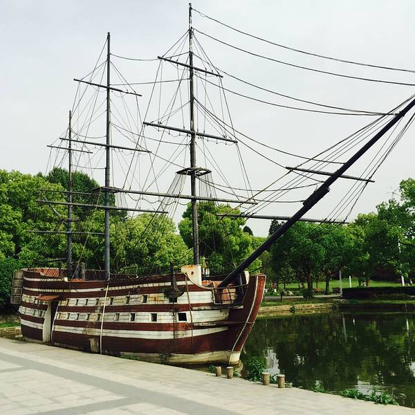 一进听涛景区梨园大门内进不远便到,建筑仿造欧洲风格,充满异国风情。很多女孩子喜欢在不同的屋子前长时间拍照。她们可否意识到,自己也有可能成为其他游客拍下来的美景了。园中有一大水池,那个哥伦布战船尤为醒目,只不过空余桅杆,船帆都不知哪里去了。整个园区给人感觉有点破旧,通过小径来到其中一处建筑前查看,觉得这里原来应该想打造成充满西方小镇风情的度假酒店,每幢房屋就是一间客房,但后来似乎还没有开业就被荒废了。
