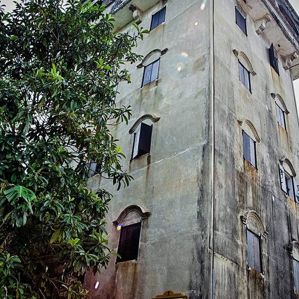 进入骏庐参观由楼梯直上到屋顶天台,近距离地看到了这欧陆风情的屋顶,这或许是碉楼的一个最为外显的特征赤坎影视城酒店对面坐着班车马降龙碉楼群